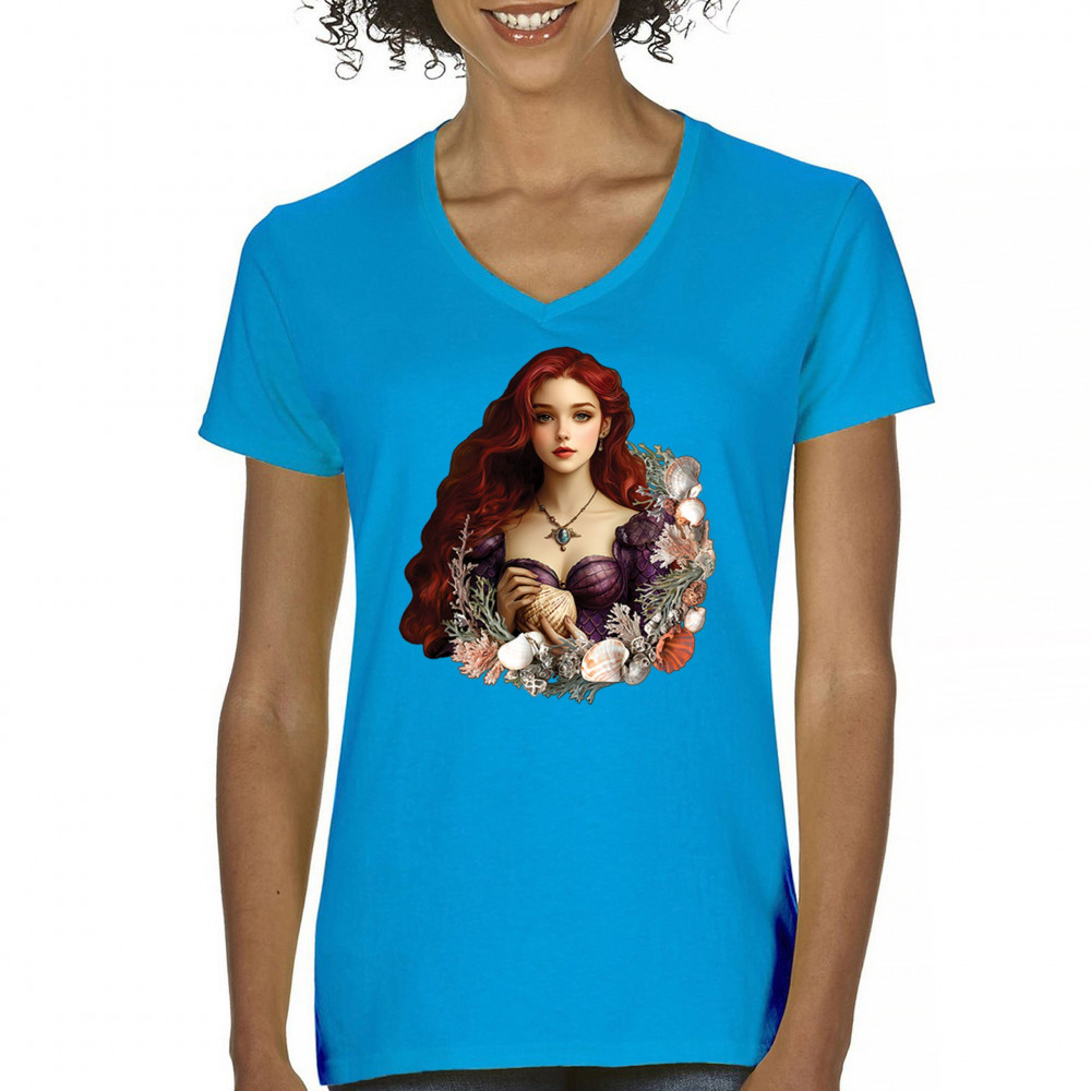 Inspired by mystical ocean themes, this design features a fantasy red-haired girl in a seashell dress, cradling a large shell. She is framed by coral, seaweed, and a shimmering array of ocean shells. With nods to classic mermaid lore and fairytale storytelling, it's perfect for fans of fantasy creatures, marine magic, and romantic ocean legends.