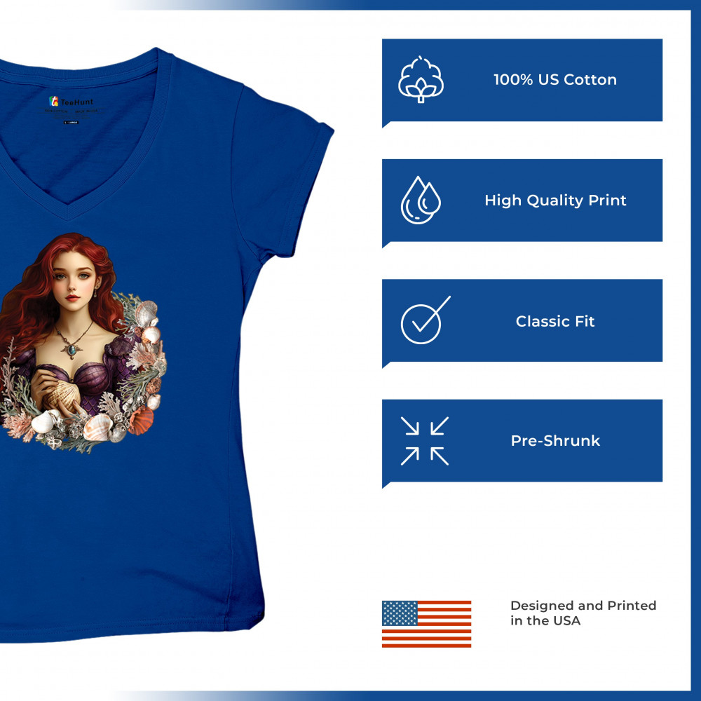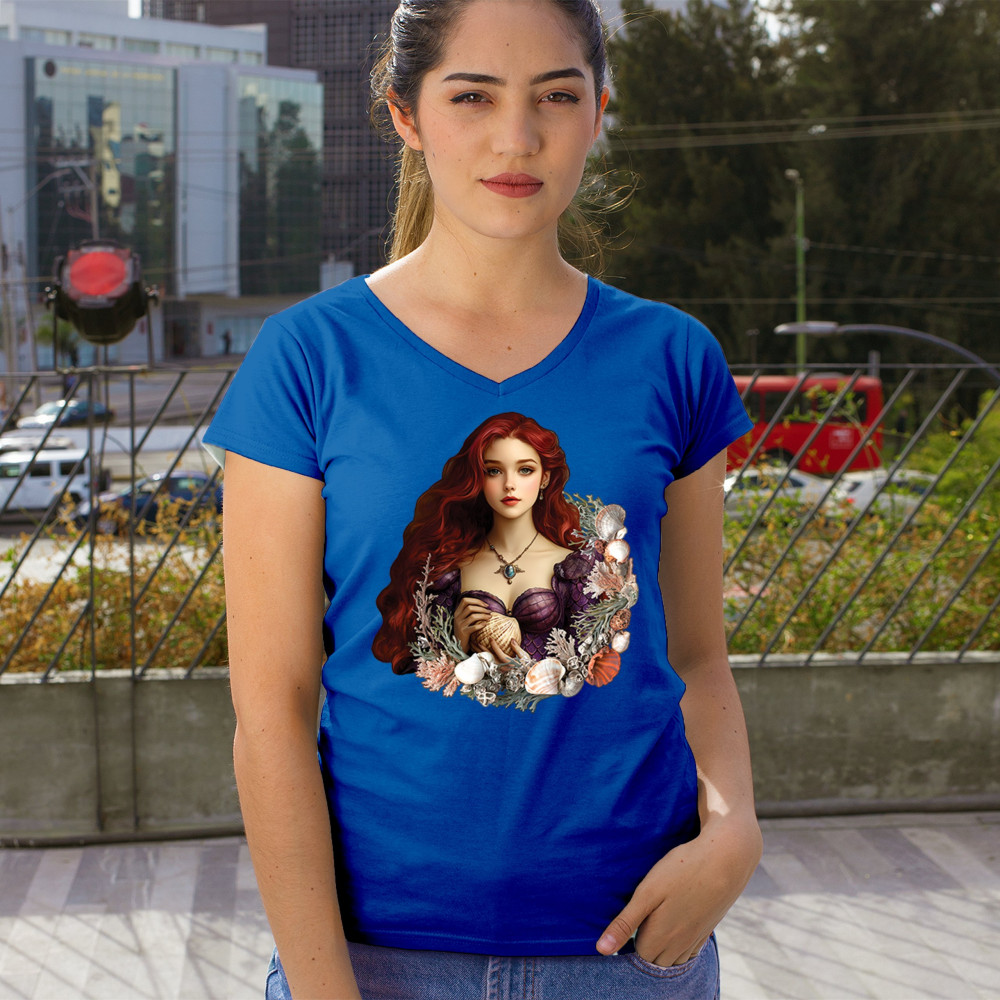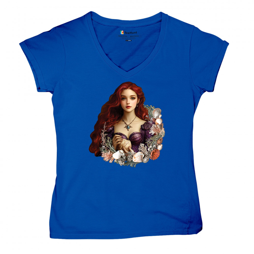 Fantasy mermaid design with red-haired girl, seashell dress, coral, and sea life. A dreamy tribute to marine magic and coastal fairytales.