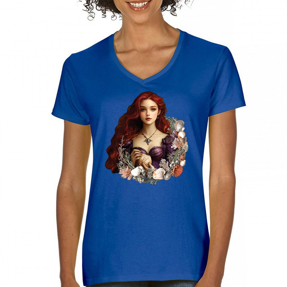 Inspired by mystical ocean themes, this design features a fantasy red-haired girl in a seashell dress, cradling a large shell. She is framed by coral, seaweed, and a shimmering array of ocean shells. With nods to classic mermaid lore and fairytale storytelling, it's perfect for fans of fantasy creatures, marine magic, and romantic ocean legends.
