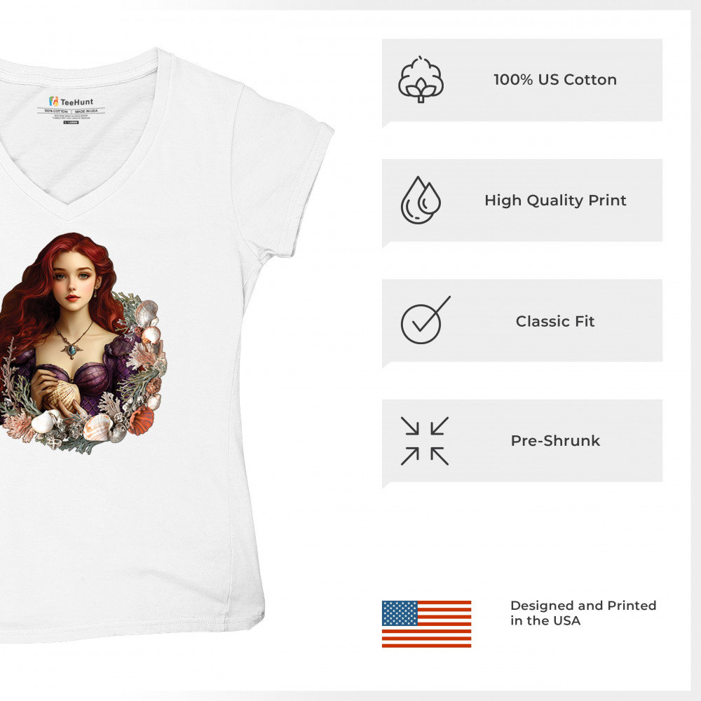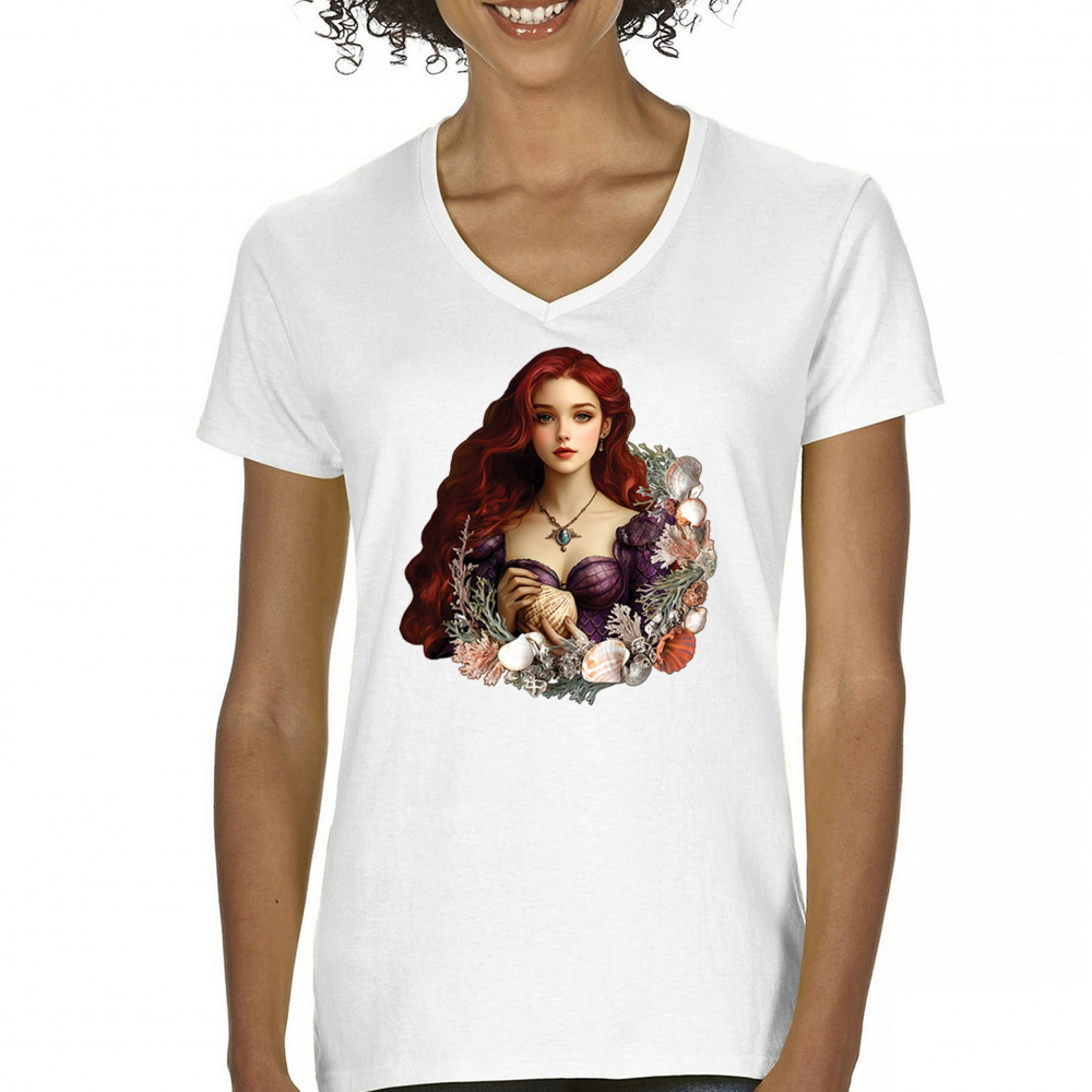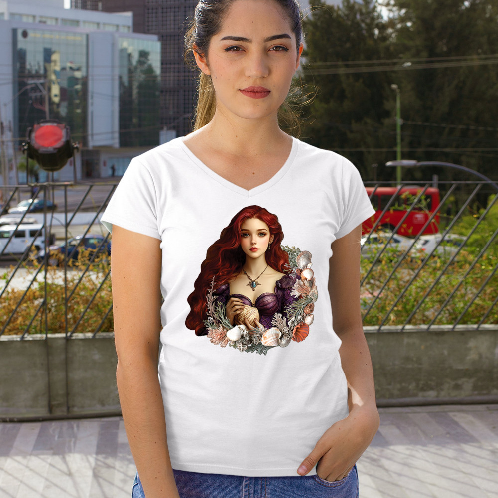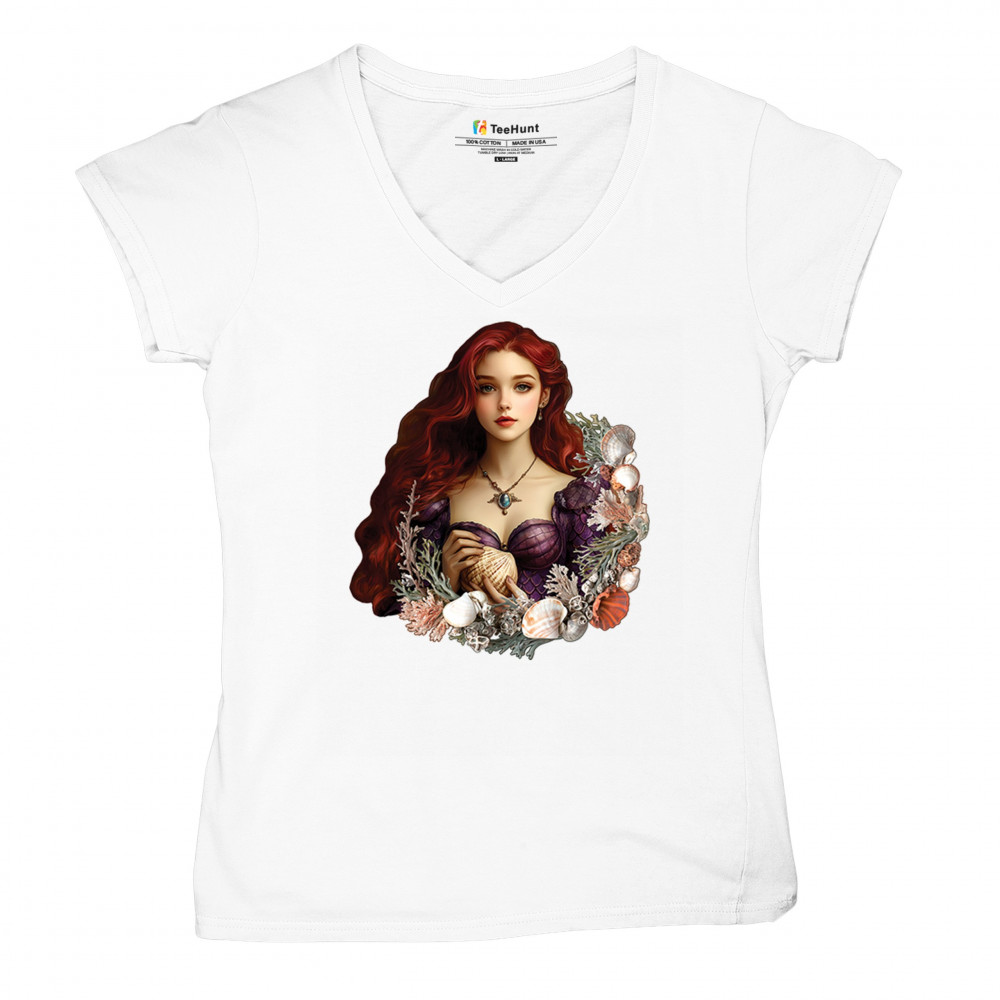 Inspired by mystical ocean themes, this design features a fantasy red-haired girl in a seashell dress, cradling a large shell. She is framed by coral, seaweed, and a shimmering array of ocean shells. With nods to classic mermaid lore and fairytale storytelling, it's perfect for fans of fantasy creatures, marine magic, and romantic ocean legends.