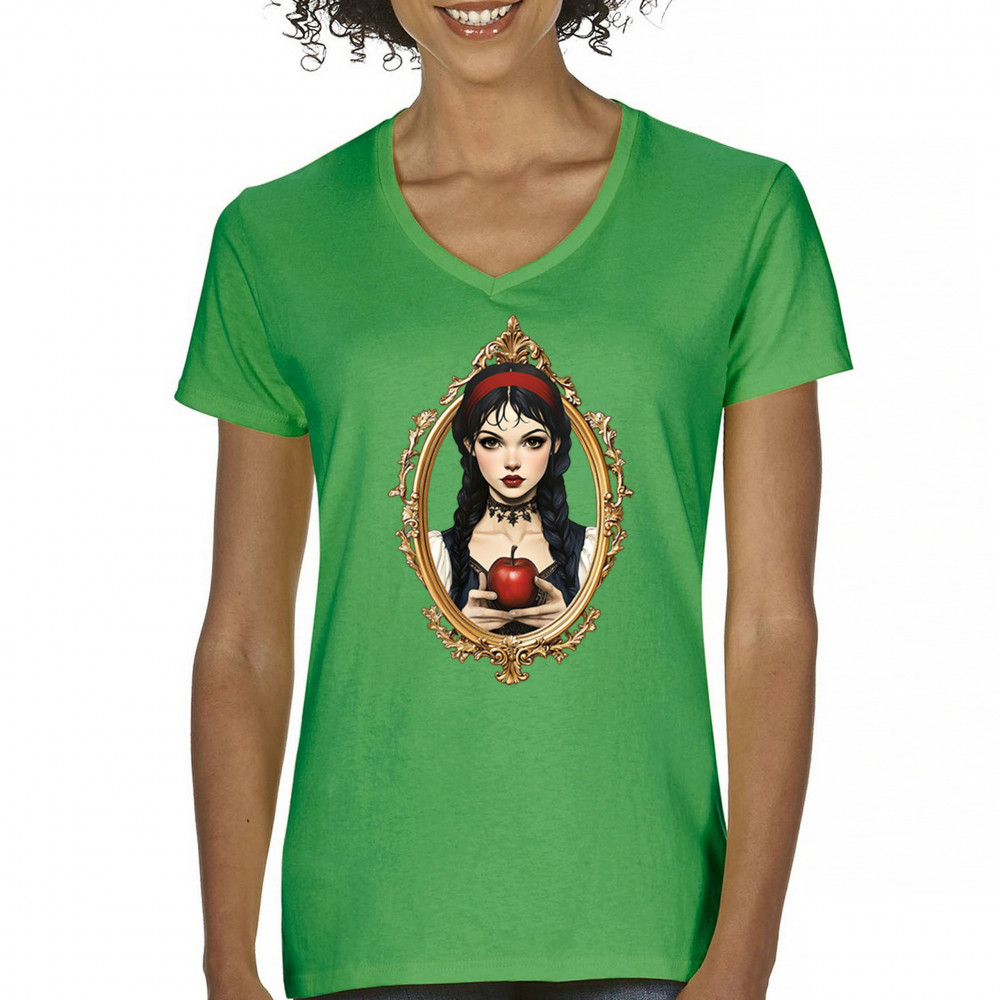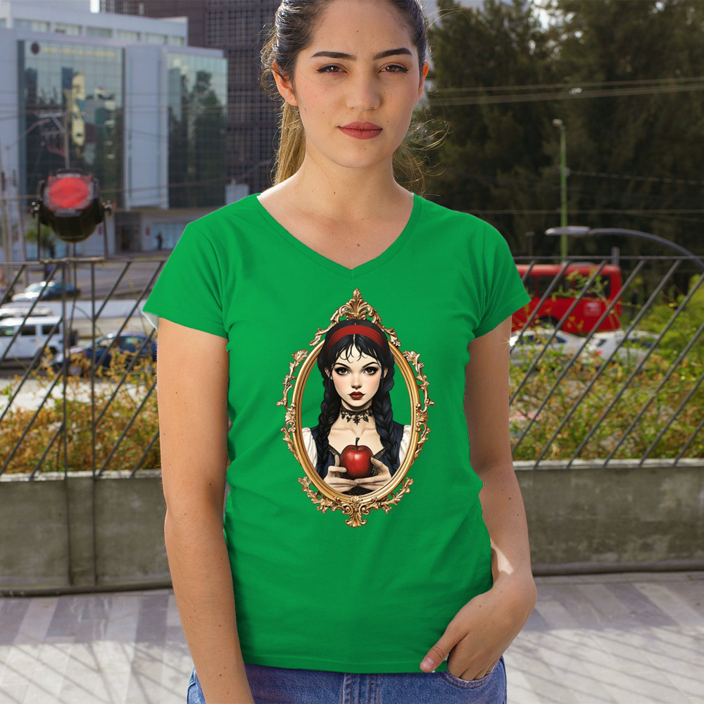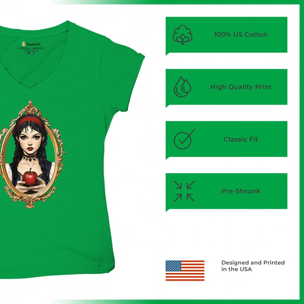 Dark fairytale design with red apple, gold frame, and Snow White vibes. A dreamy blend of fantasy, gothic style, and magical storytelling.