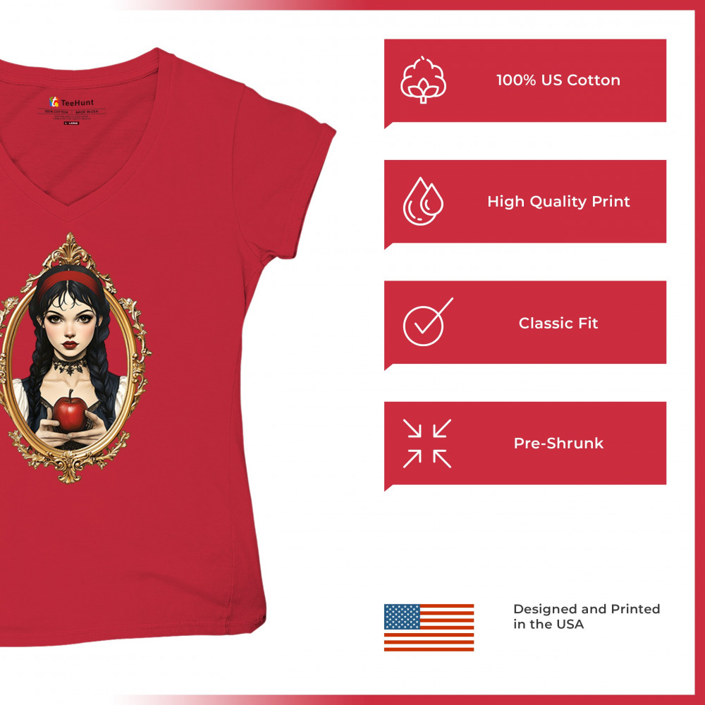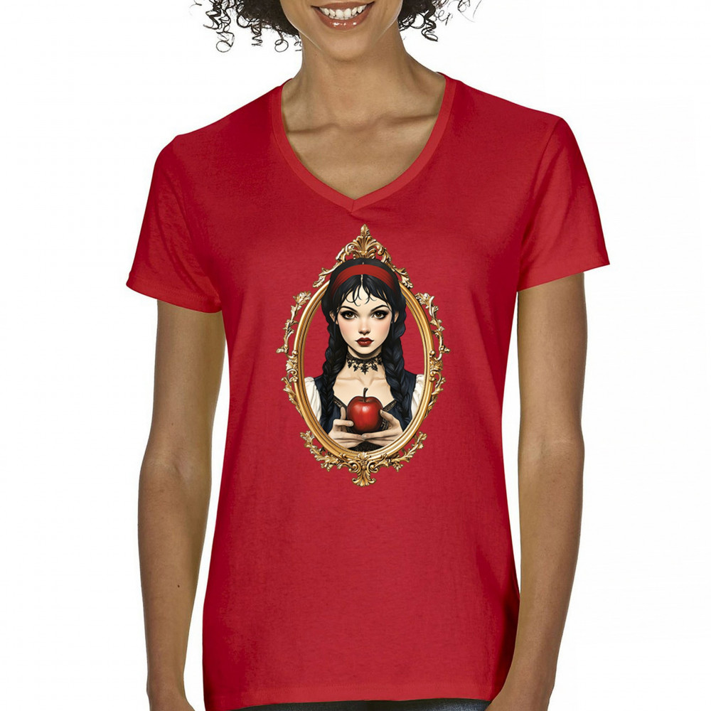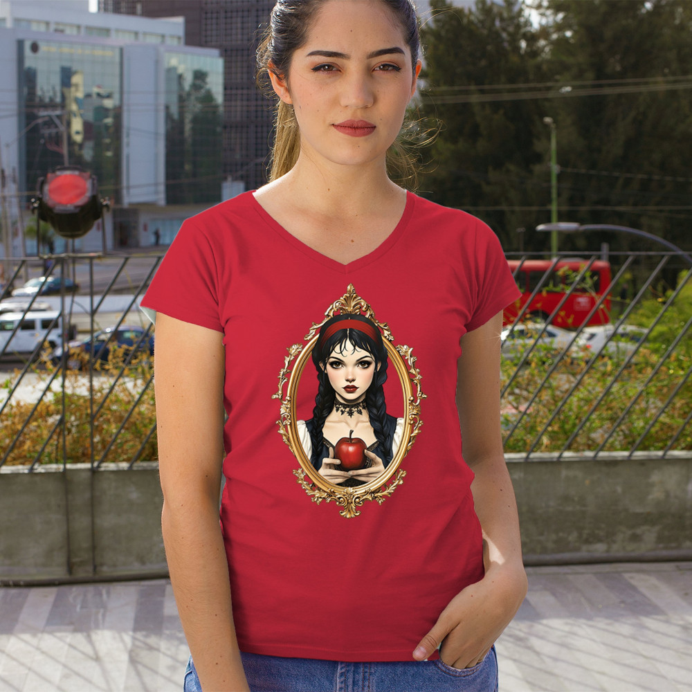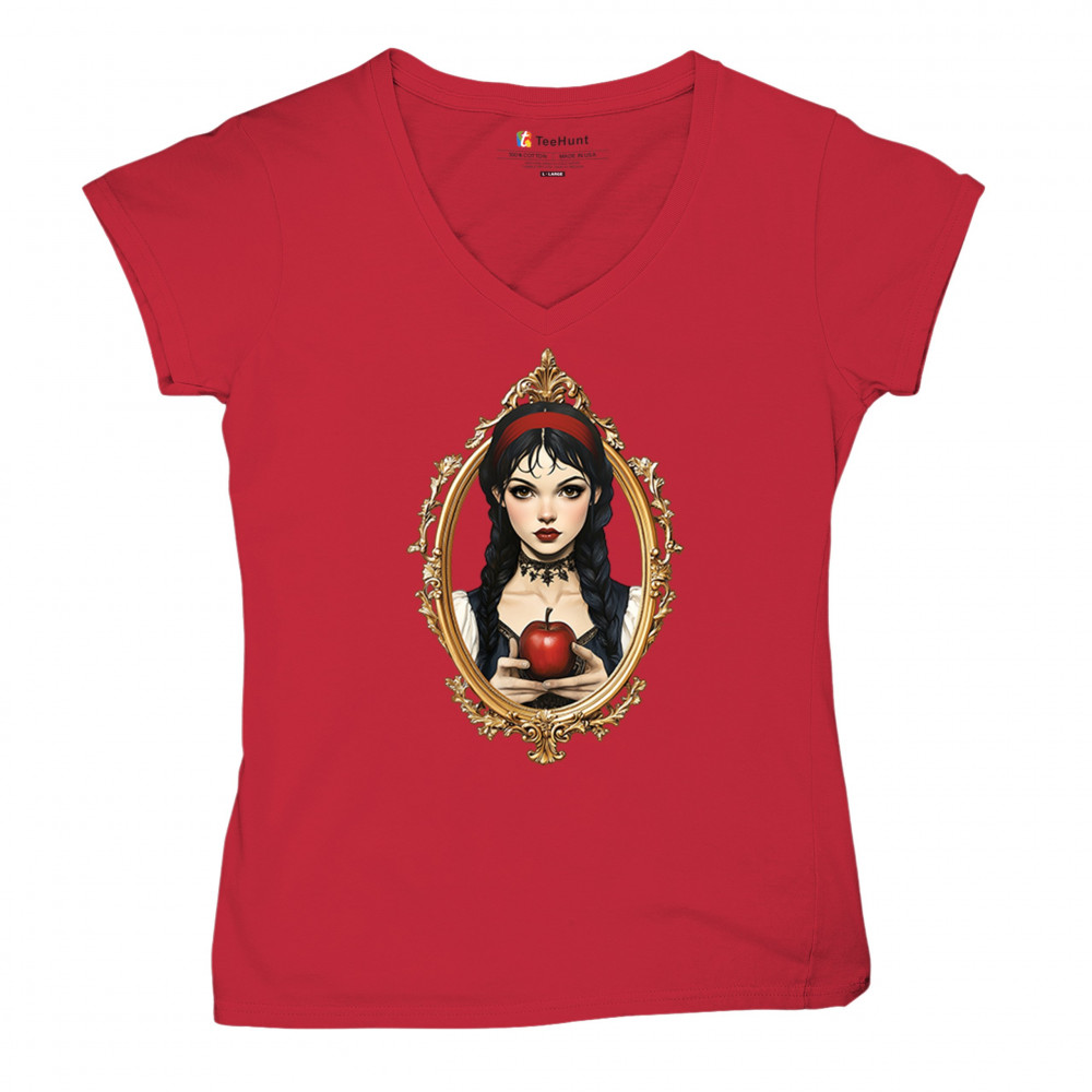 Dark fairytale design with red apple, gold frame, and Snow White vibes. A dreamy blend of fantasy, gothic style, and magical storytelling.