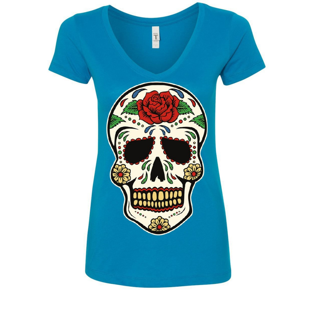 SUGAR SKULL CALAVERA DIA DE LOS MUERTOS sugar skull calavera women's v-neck t-shirt dia de los muertos day of the dead turquoise