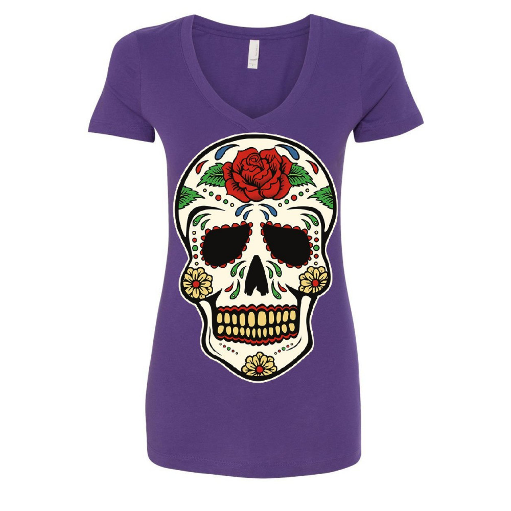 SUGAR SKULL CALAVERA DIA DE LOS MUERTOS sugar skull calavera women's v-neck t-shirt dia de los muertos day of the dead purple