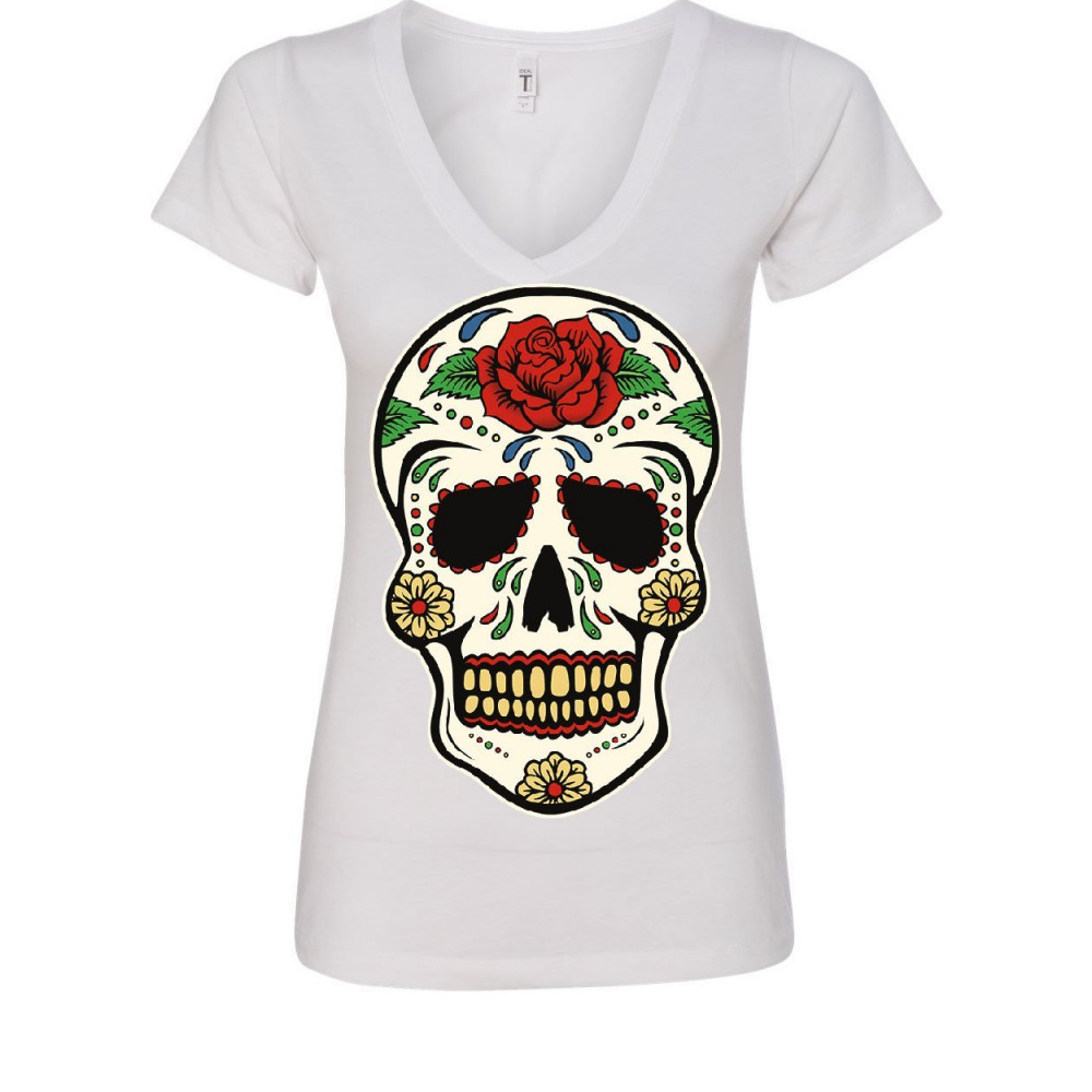 SUGAR SKULL CALAVERA DIA DE LOS MUERTOS sugar skull calavera women's v-neck t-shirt dia de los muertos day of the dead white