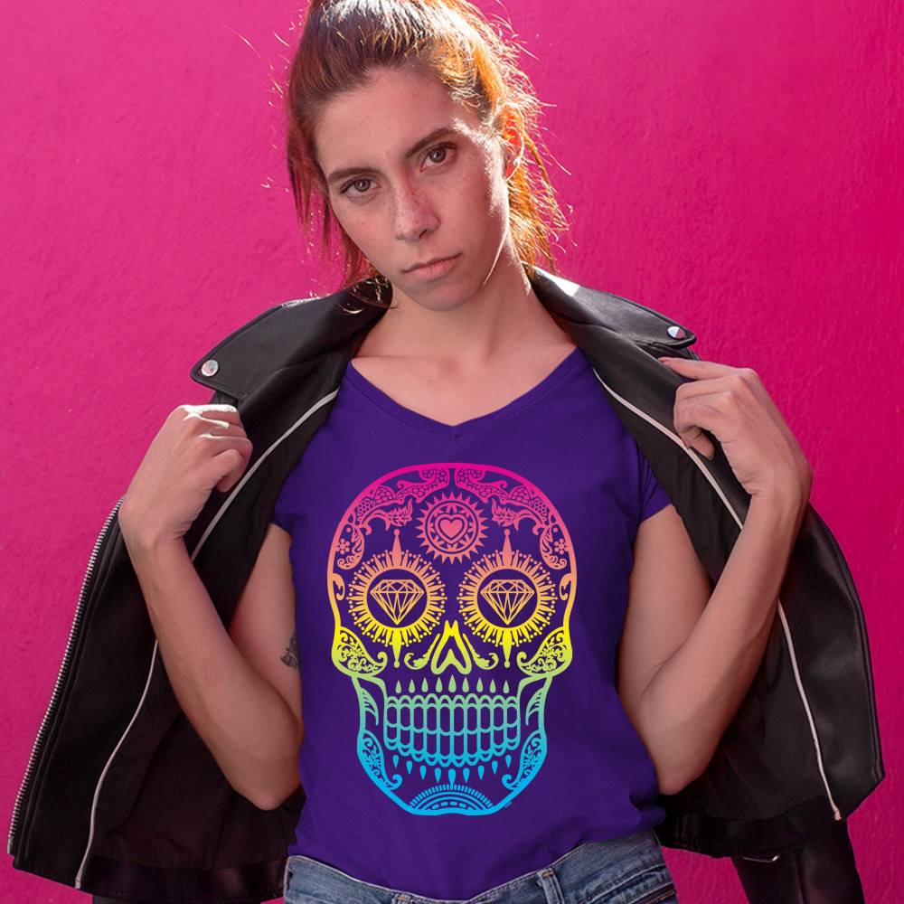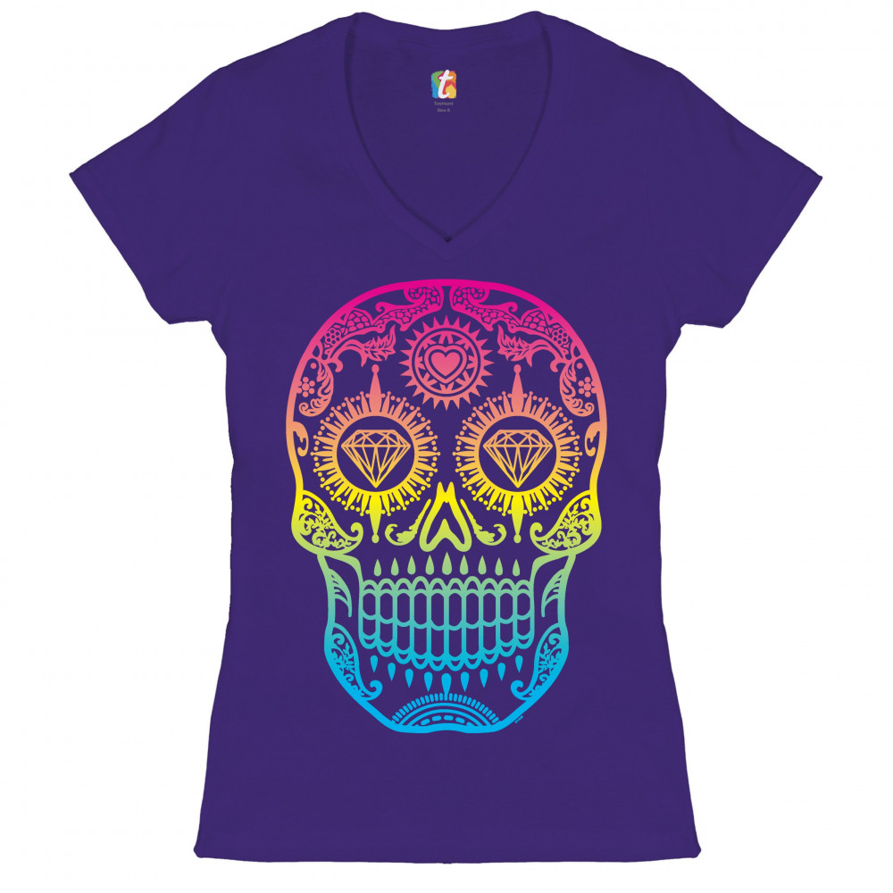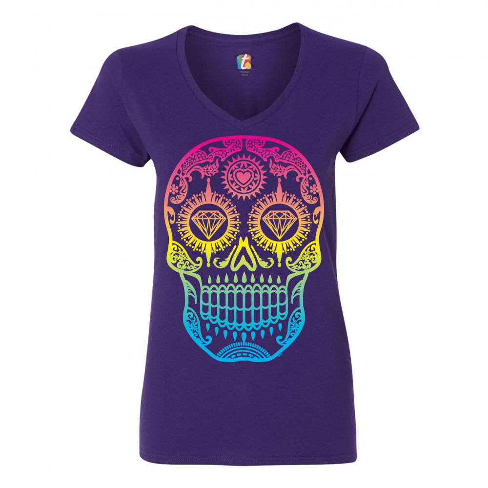 SUGAR SKULL CALAVERA DIAMOND EYES women's v-neck t-shirt day of the dead tee purple