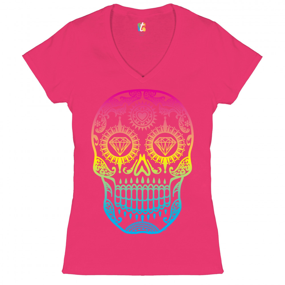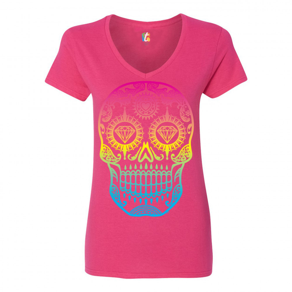 SUGAR SKULL CALAVERA DIAMOND EYES women's v-neck t-shirt day of the dead tee pink