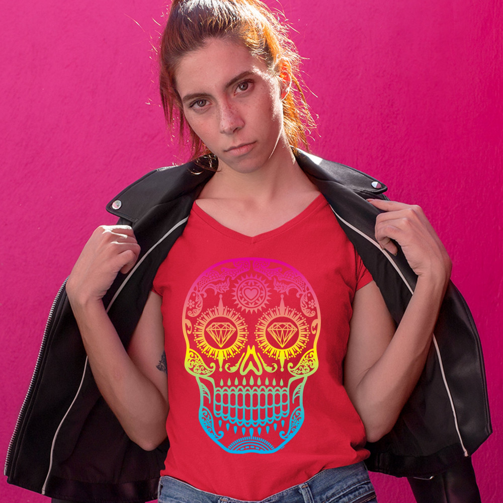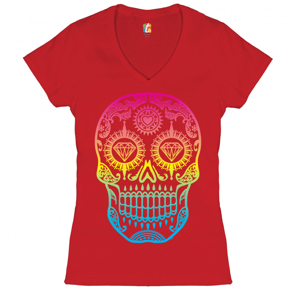 SUGAR SKULL CALAVERA DIAMOND EYES women's v-neck t-shirt day of the dead tee red