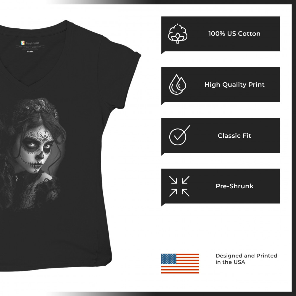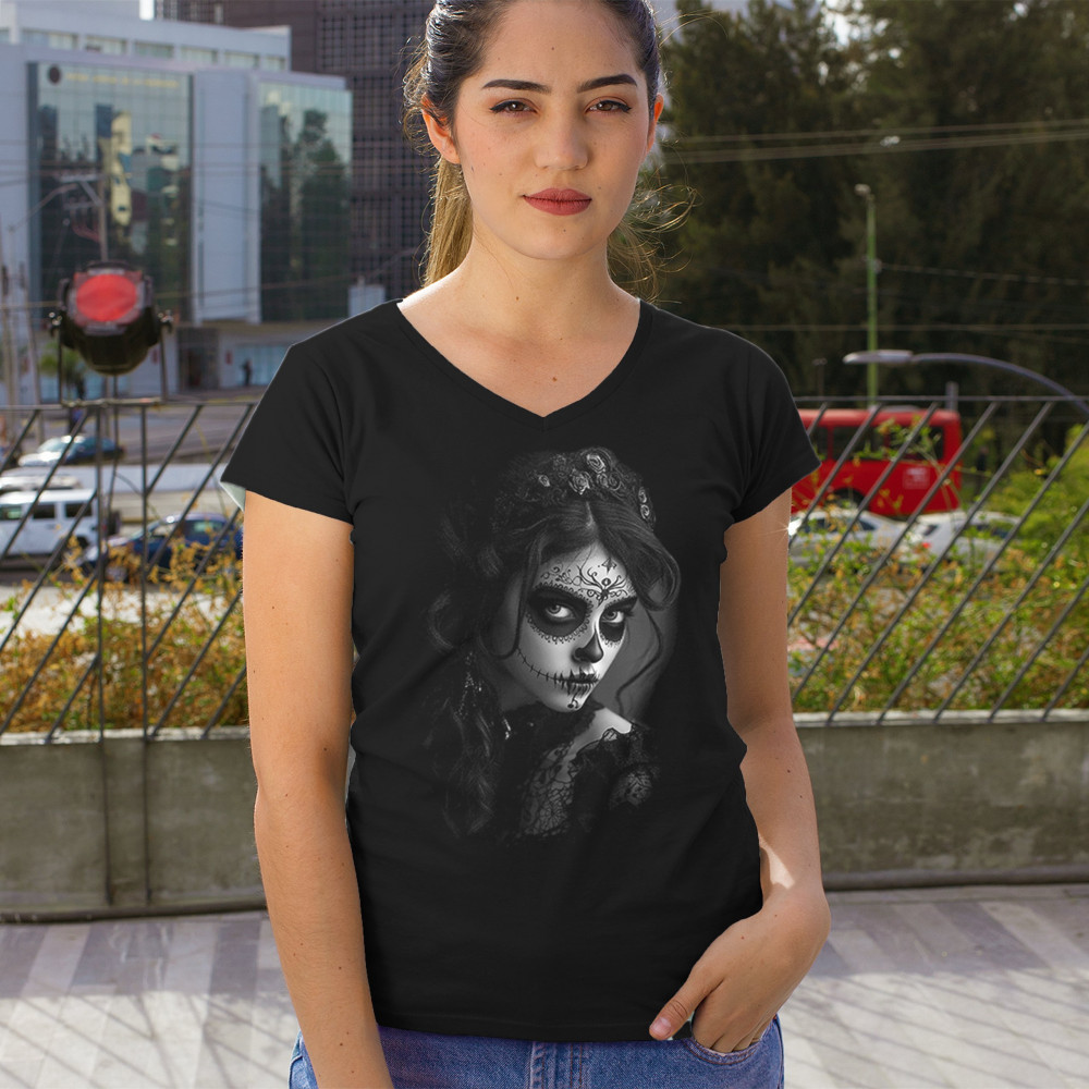 Showcasing a gothic woman with a sugar skull face, this black-and-white design blends DÃa de los Muertos tradition with dark elegance. Intricate face makeup, detailed lace, and a bold monochrome aesthetic create a dramatic visual tribute. A perfect piece for lovers of skull motifs, alt style, and haunting beauty.