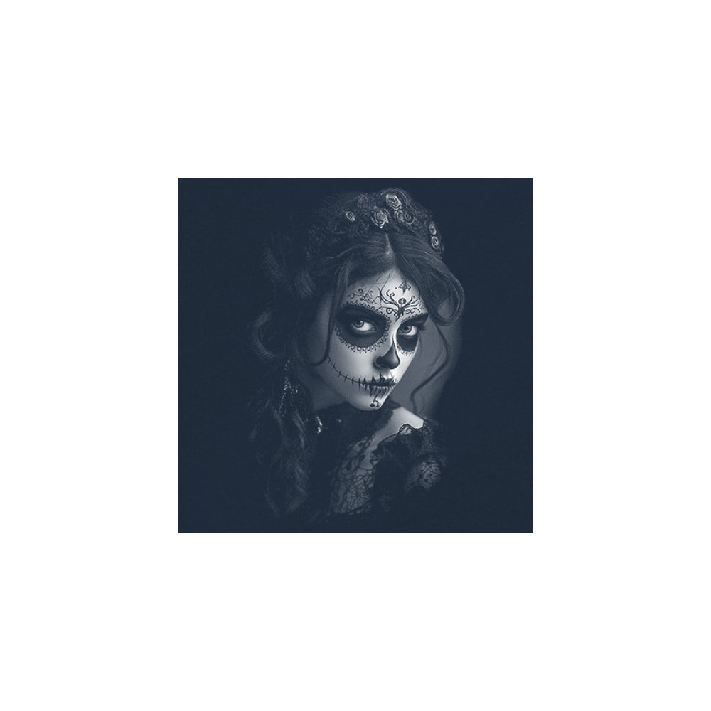 Showcasing a gothic woman with a sugar skull face, this black-and-white design blends DÃa de los Muertos tradition with dark elegance. Intricate face makeup, detailed lace, and a bold monochrome aesthetic create a dramatic visual tribute. A perfect piece for lovers of skull motifs, alt style, and haunting beauty.