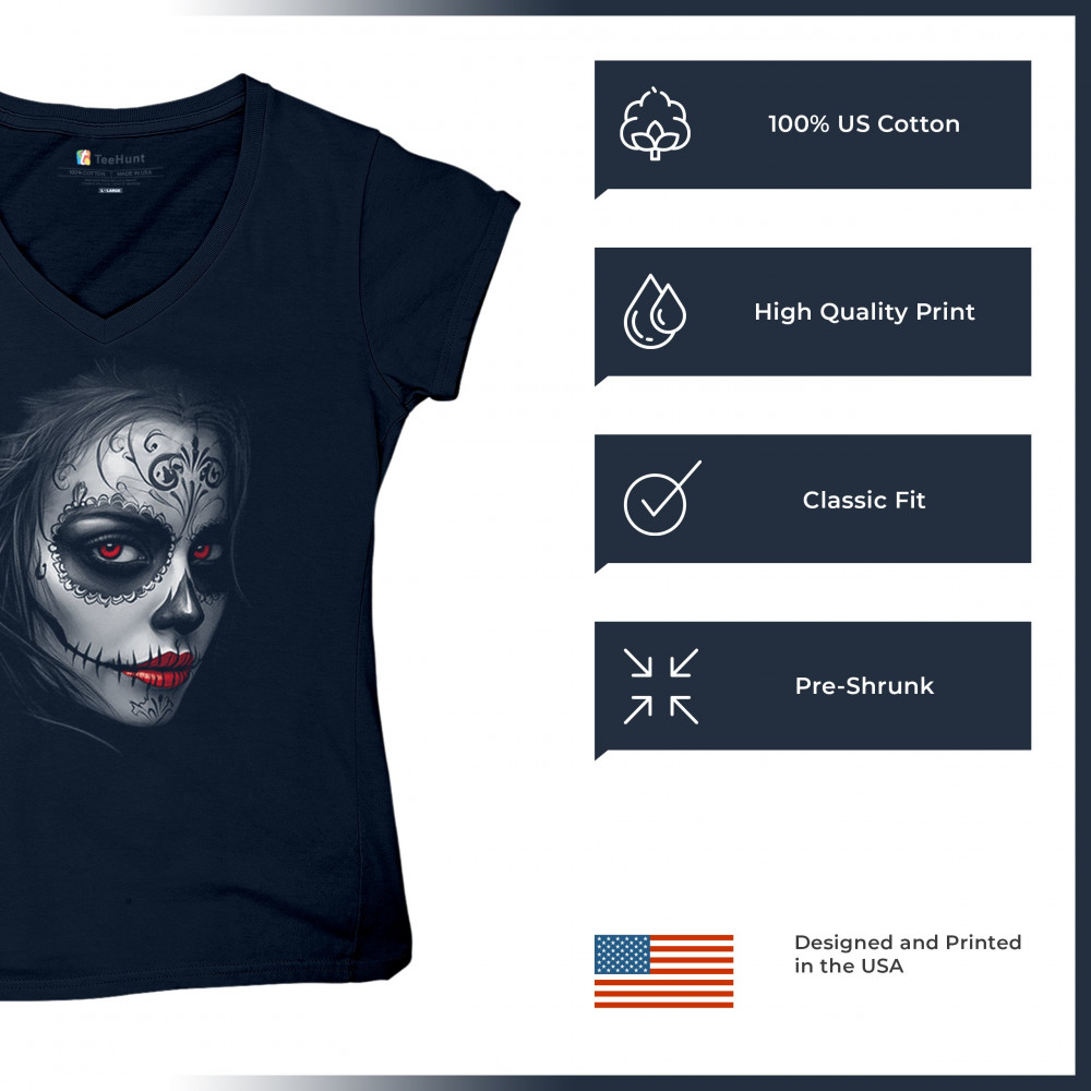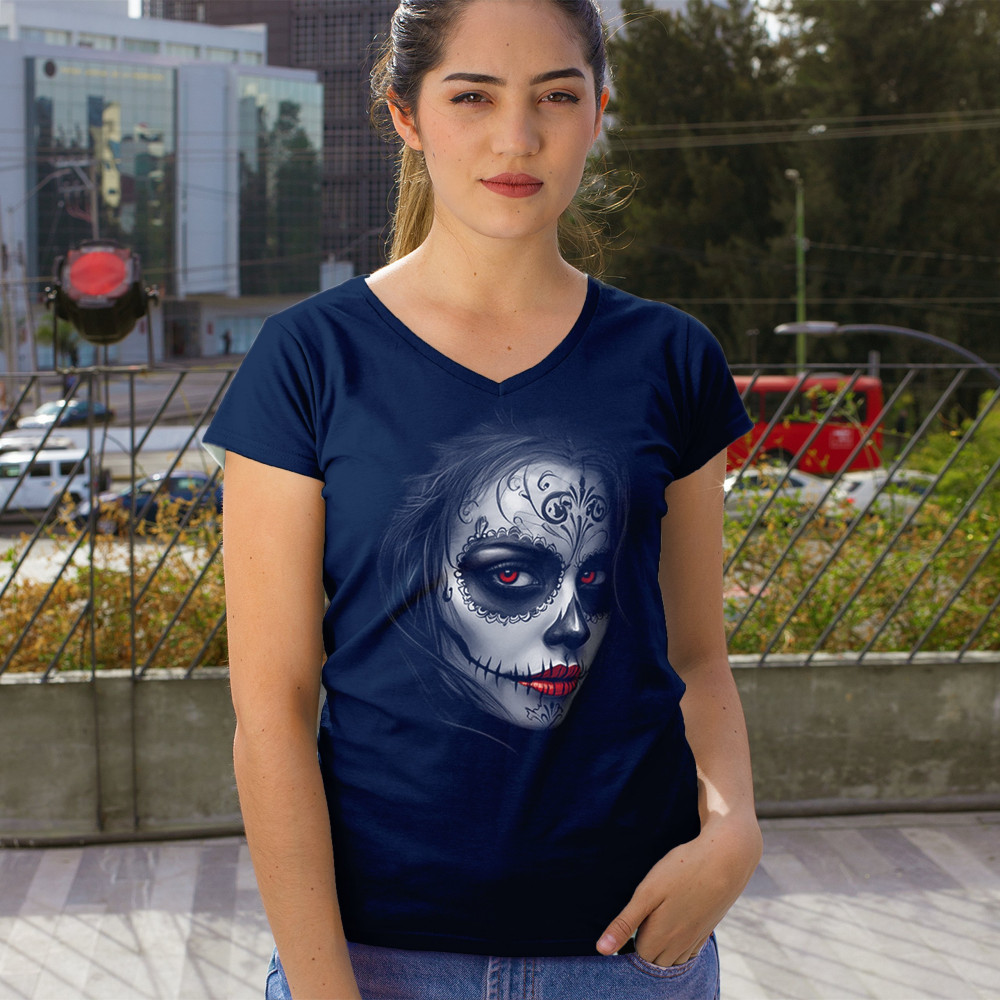 Bold sugar skull design with red eyes, red lips, and gothic makeup. Perfect for Day of the Dead, Halloween, or dark fashion vibes.