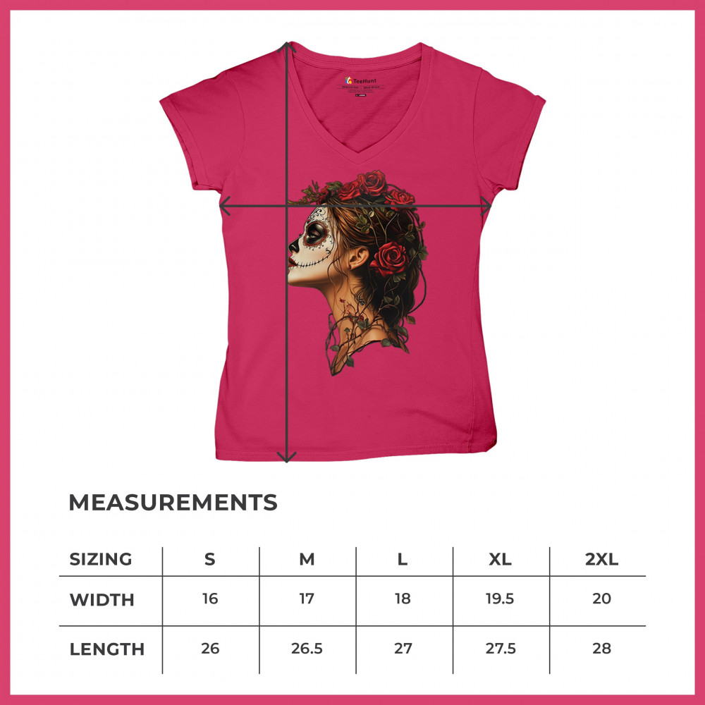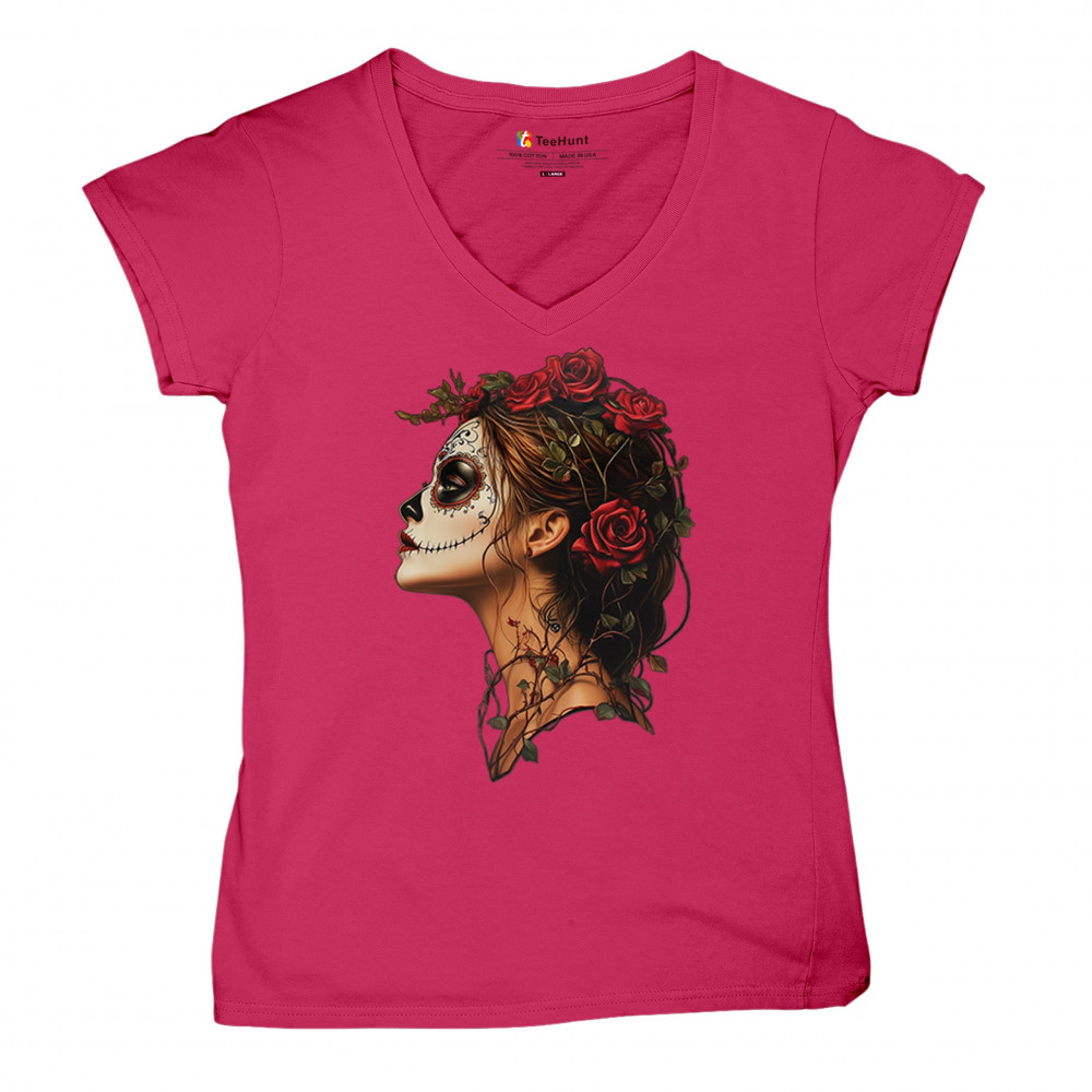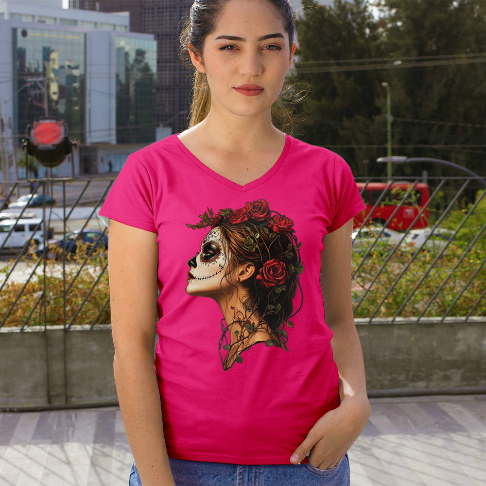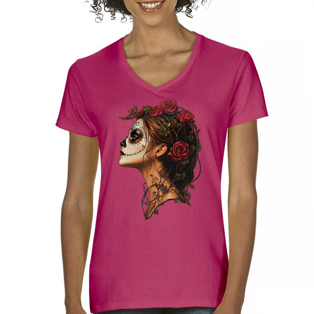 Celebrate feminine power and gothic elegance with this captivating DÃa de los Muertos design. Featuring a woman in profile with sugar skull makeup, blooming red roses, natural vines, dark hair, and symbolic floral skull art, this bold tribute captures beauty, death, and strength in one romantic, detailed visual.