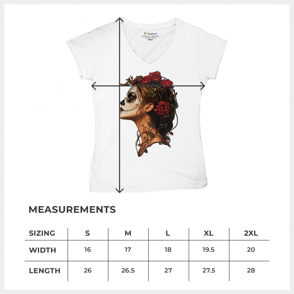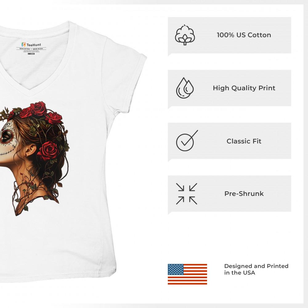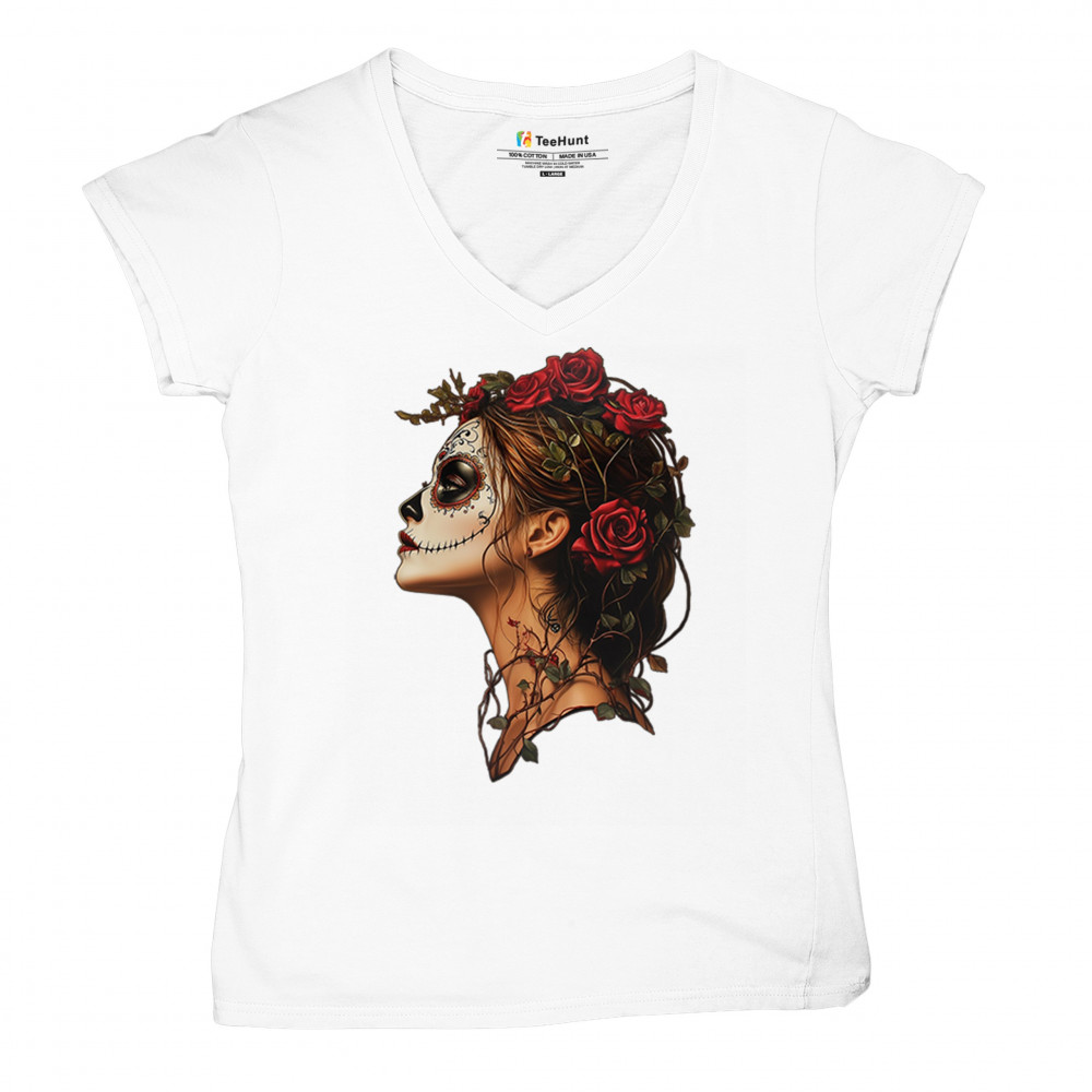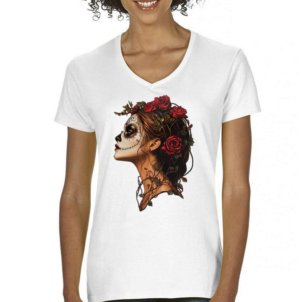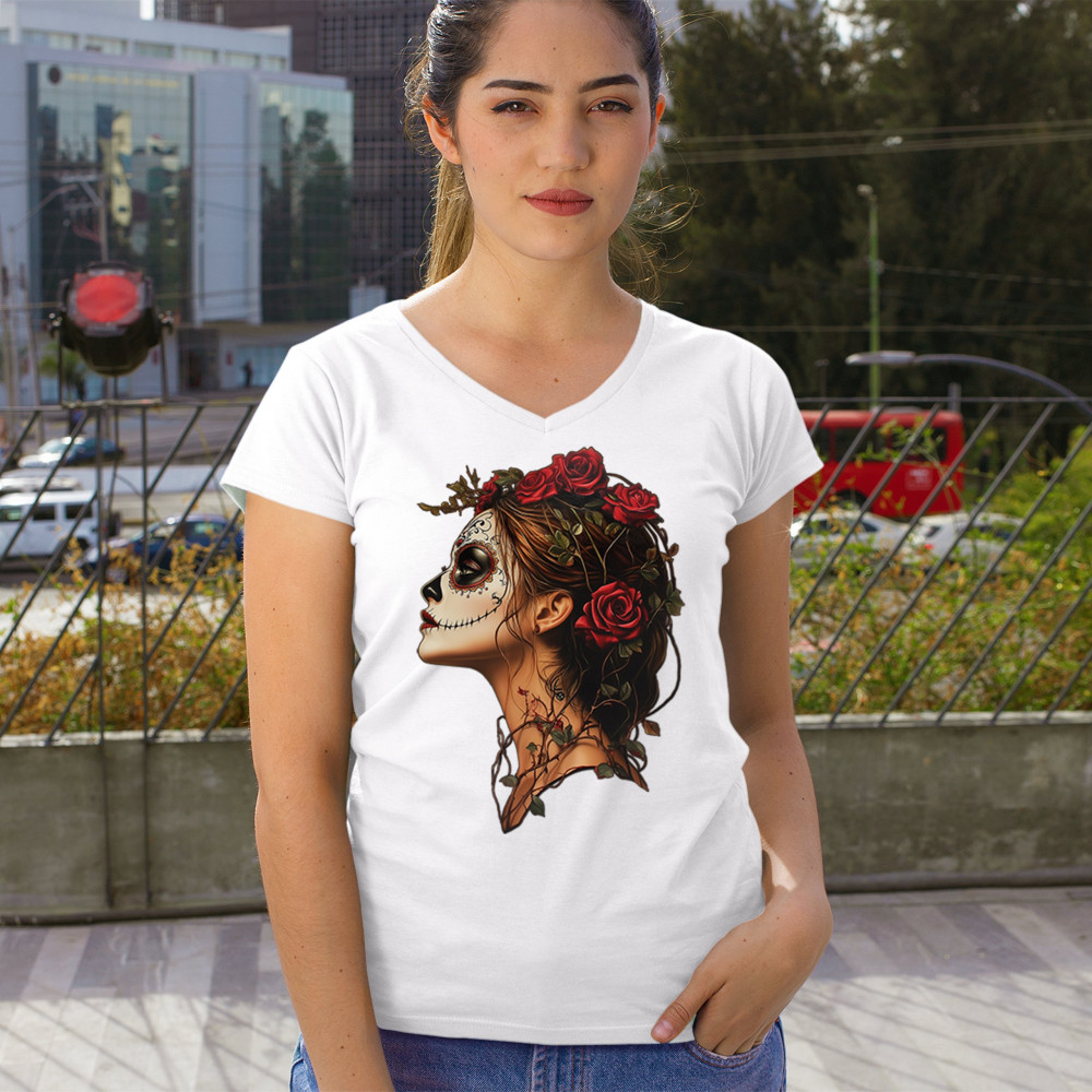 Celebrate feminine power and gothic elegance with this captivating DÃa de los Muertos design. Featuring a woman in profile with sugar skull makeup, blooming red roses, natural vines, dark hair, and symbolic floral skull art, this bold tribute captures beauty, death, and strength in one romantic, detailed visual.