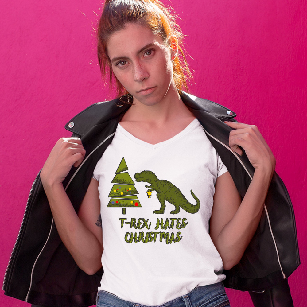 T-REX HATES CHRISTMAS women's v-neck t-shirt funny dinosaur xmas festive tee white