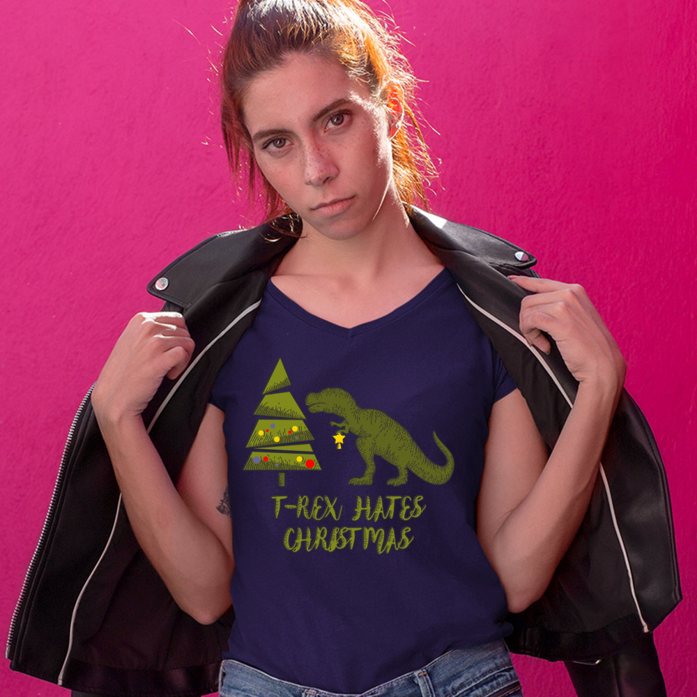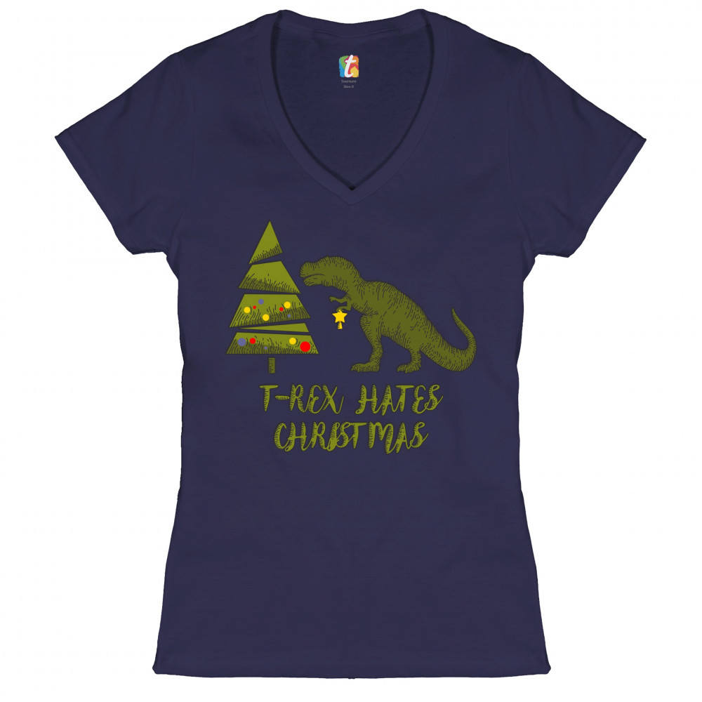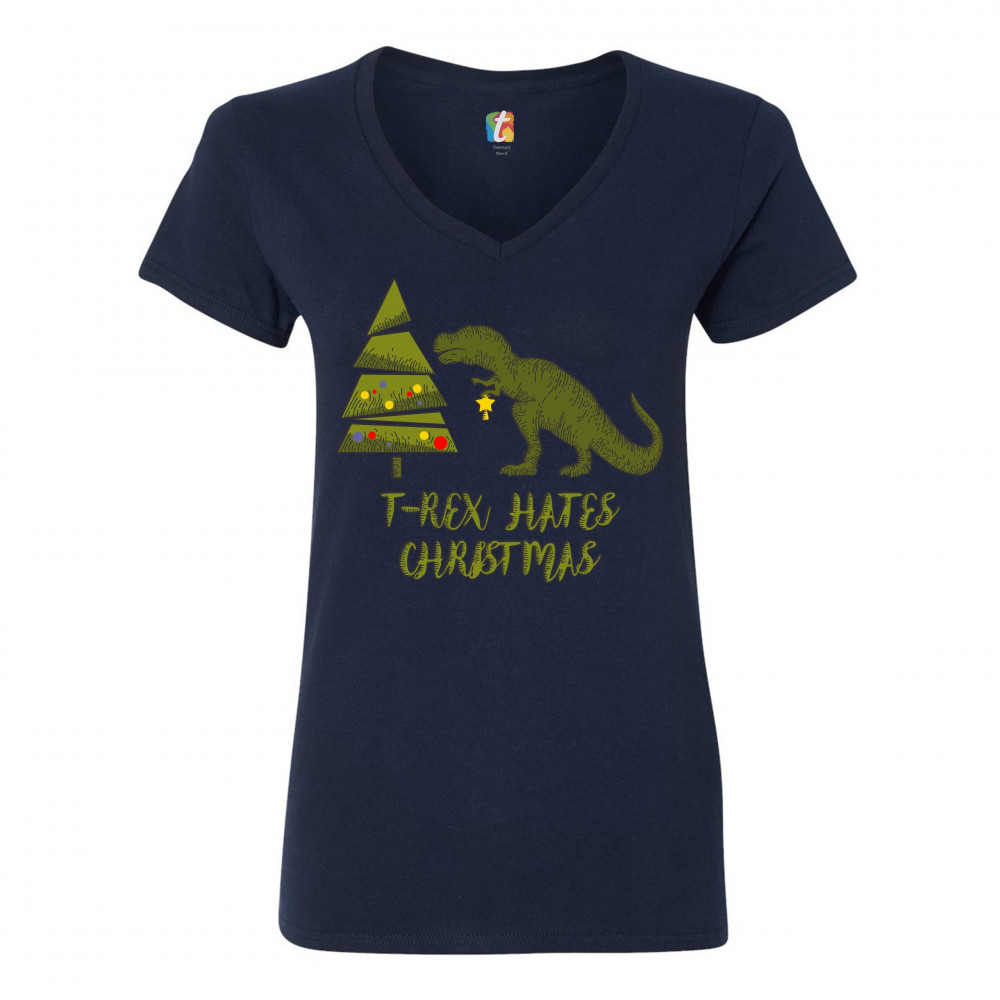 T-REX HATES CHRISTMAS women's v-neck t-shirt funny dinosaur xmas festive tee navy blue