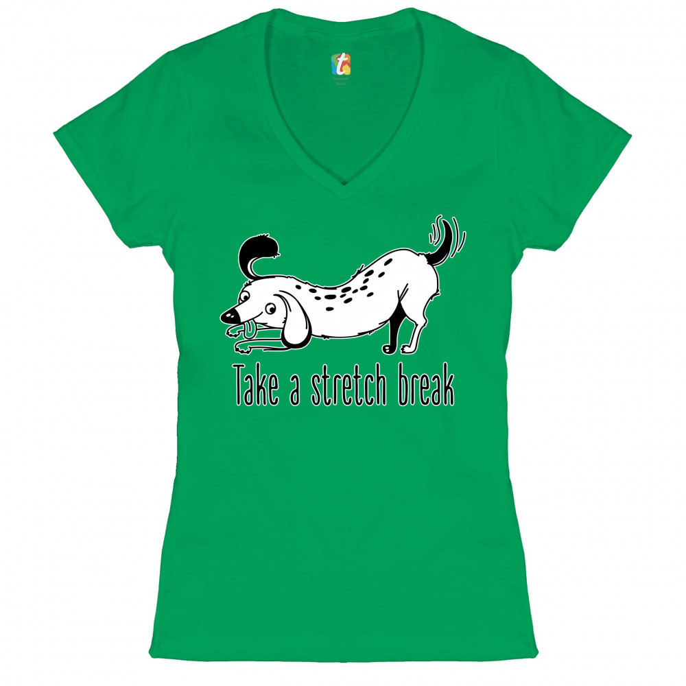TAKE A STRETCH BREAK women's v-neck t-shirt dachshund dog lover pet owner tee green