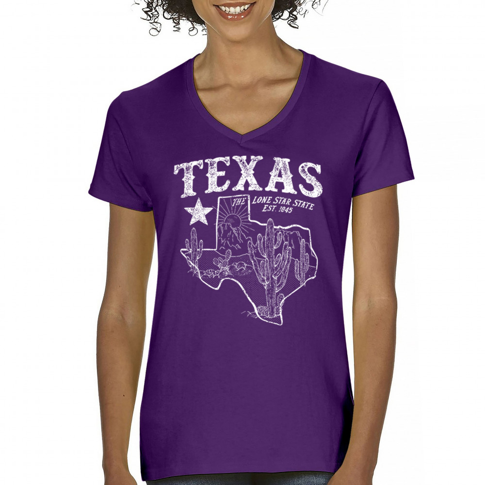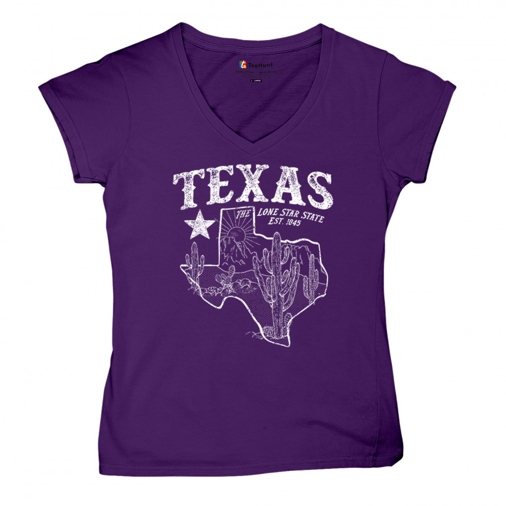 Vintage Texas pride design with cactus, mountains, Lone Star symbol, and 1845 tribute—perfect for rodeos and western events.