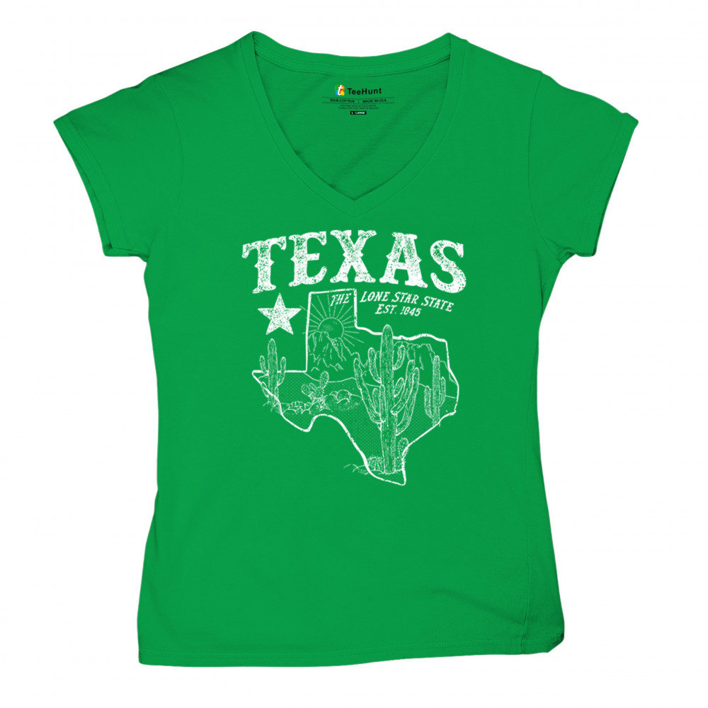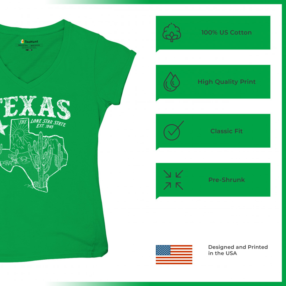 Vintage Texas pride design with cactus, mountains, Lone Star symbol, and 1845 tribute—perfect for rodeos and western events.