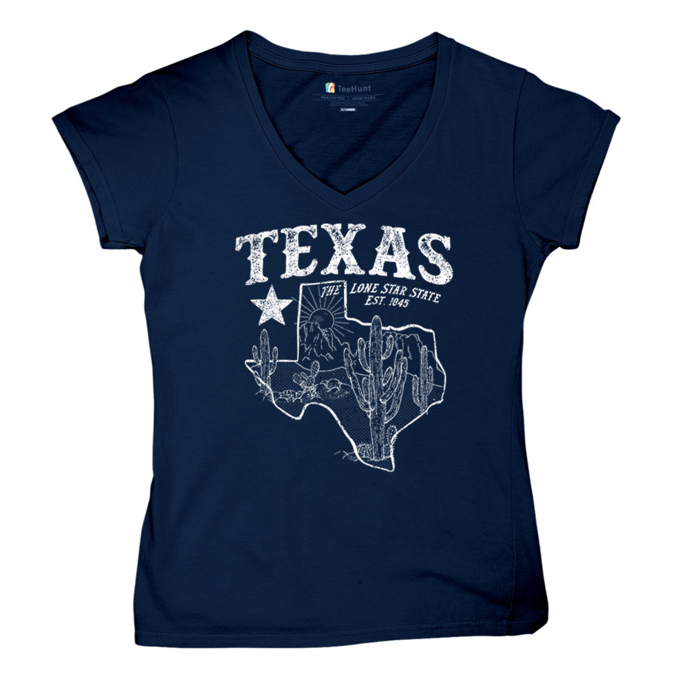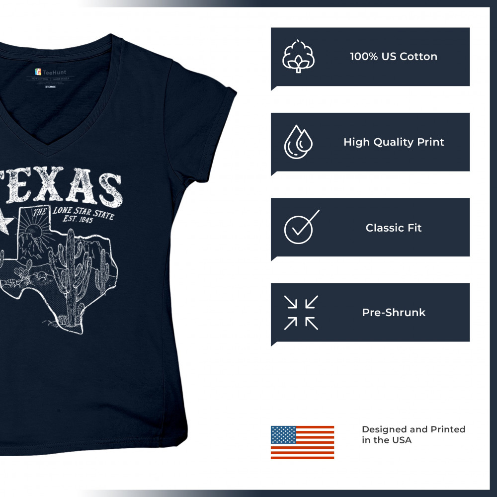 Vintage Texas pride design with cactus, mountains, Lone Star symbol, and 1845 tribute—perfect for rodeos and western events.