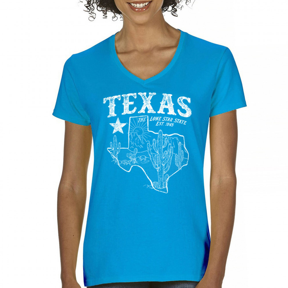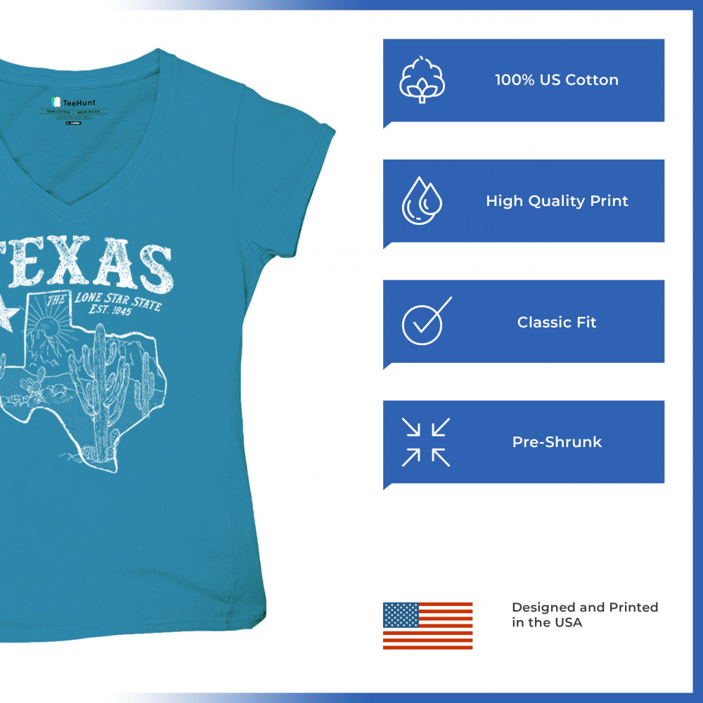 Vintage Texas pride design with cactus, mountains, Lone Star symbol, and 1845 tribute—perfect for rodeos and western events.