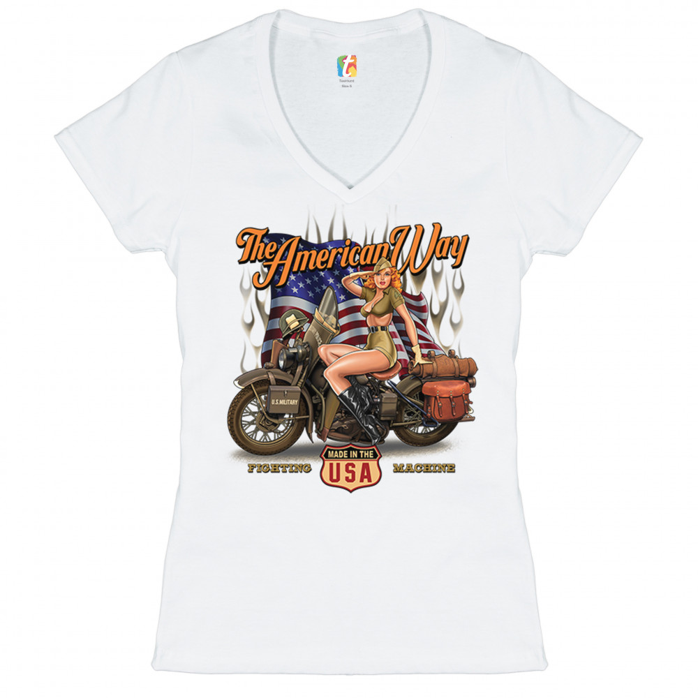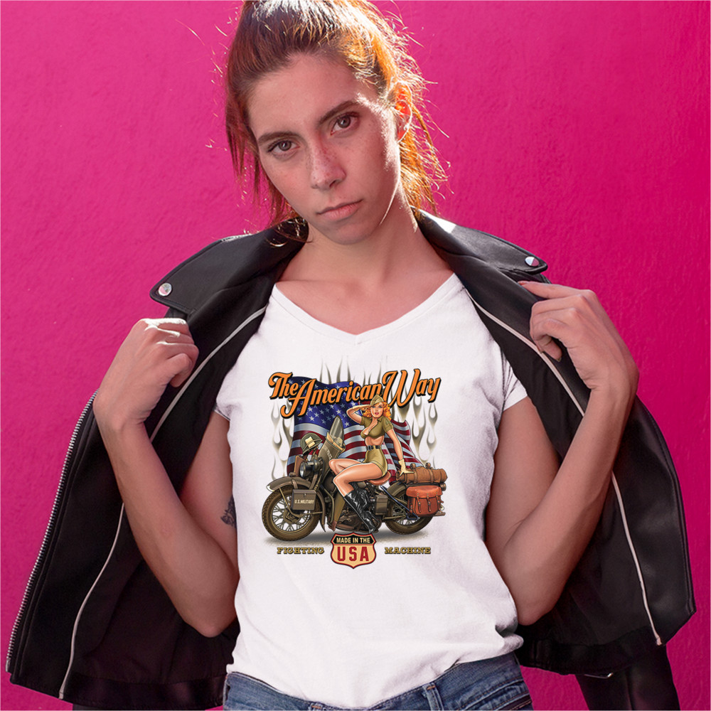A print featuring a beautiful pin-up girl in leather boots sitting on a U.S. military motorcycle. There is the American Flag in the background and the words "The American Way" above it. At the bottom of the picture there is a shield which says: "made in the USA". "Fighting Machine" is written under the motorcycle's wheels. A great choice for a motorcycle enthusiast.