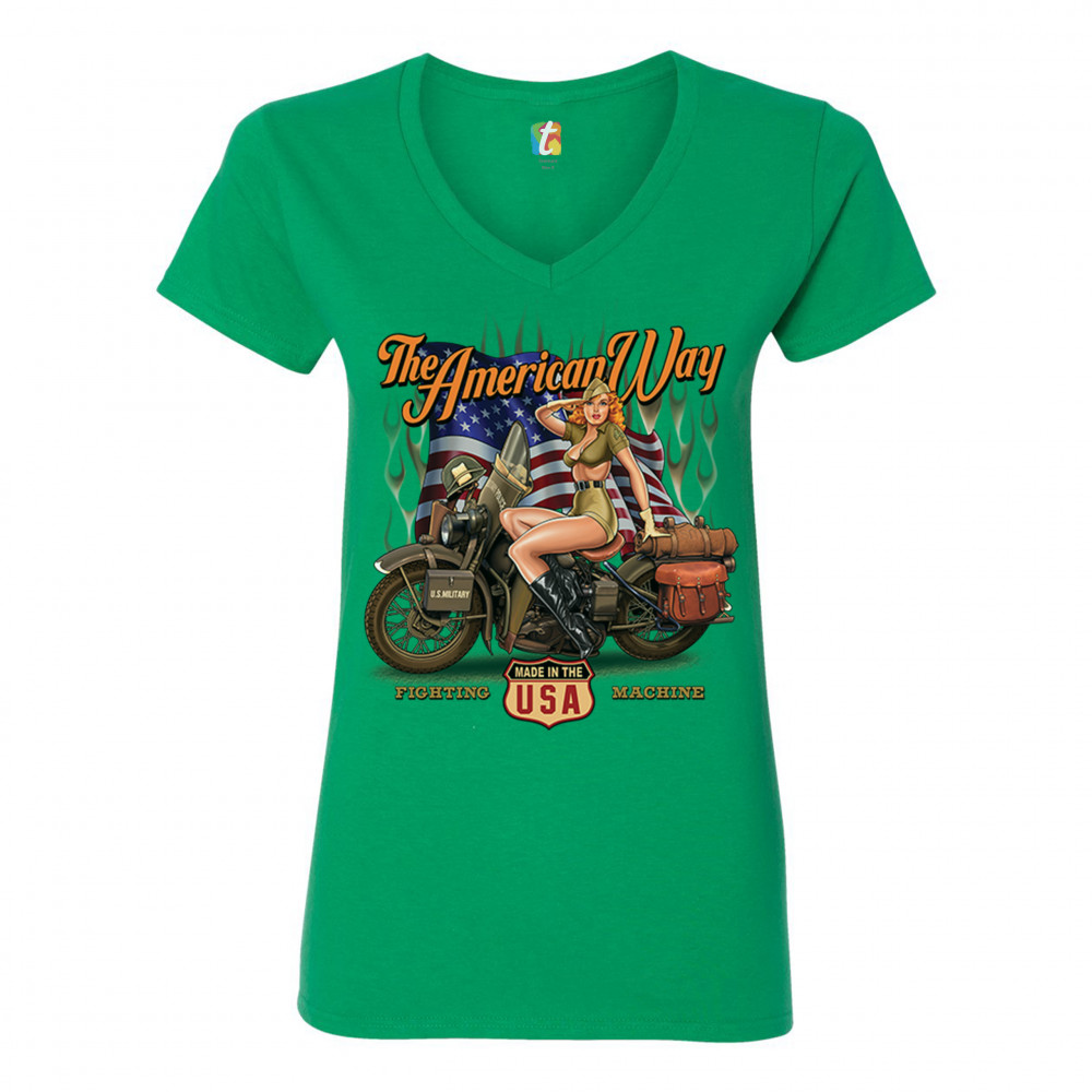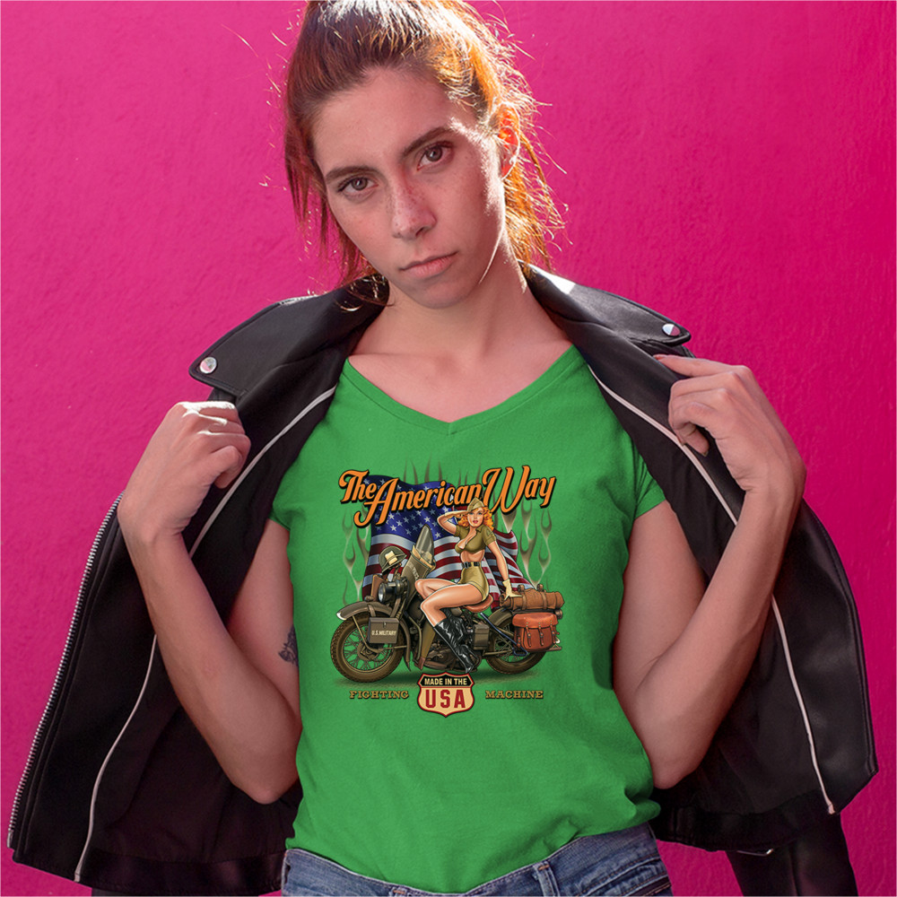A print featuring a beautiful pin-up girl in leather boots sitting on a U.S. military motorcycle. There is the American Flag in the background and the words "The American Way" above it. At the bottom of the picture there is a shield which says: "made in the USA". "Fighting Machine" is written under the motorcycle's wheels. A great choice for a motorcycle enthusiast.