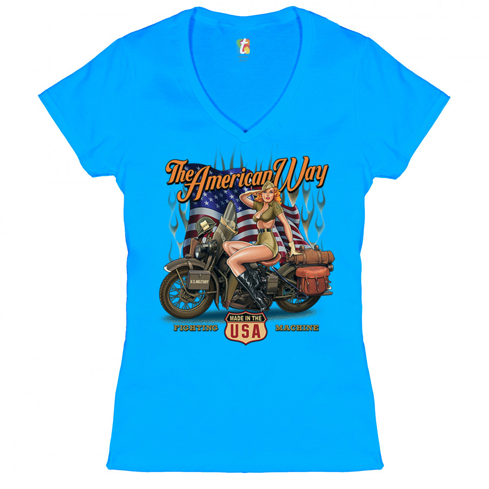 A print featuring a beautiful pin-up girl in leather boots sitting on a U.S. military motorcycle. There is the American Flag in the background and the words "The American Way" above it. At the bottom of the picture there is a shield which says: "made in the USA". "Fighting Machine" is written under the motorcycle's wheels. A great choice for a motorcycle enthusiast.