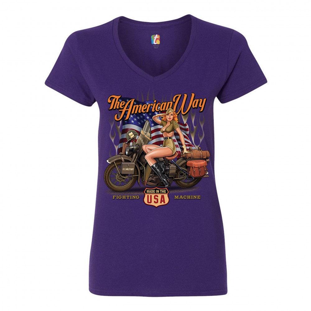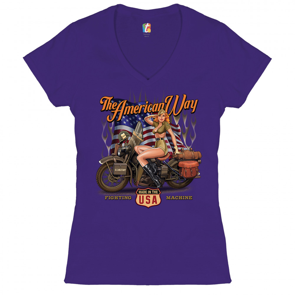 A print featuring a beautiful pin-up girl in leather boots sitting on a U.S. military motorcycle. There is the American Flag in the background and the words "The American Way" above it. At the bottom of the picture there is a shield which says: "made in the USA". "Fighting Machine" is written under the motorcycle's wheels. A great choice for a motorcycle enthusiast.