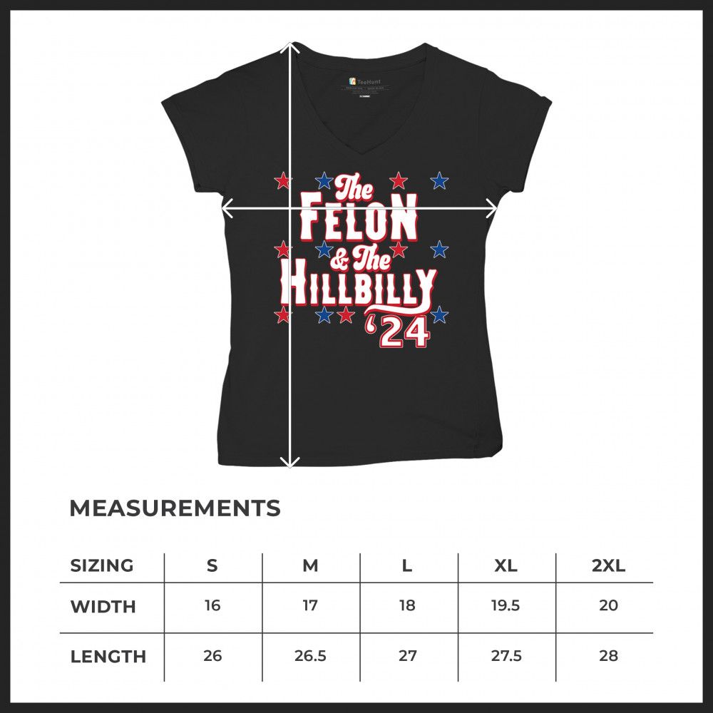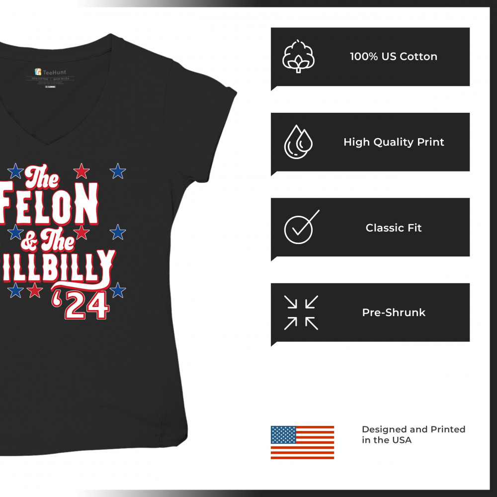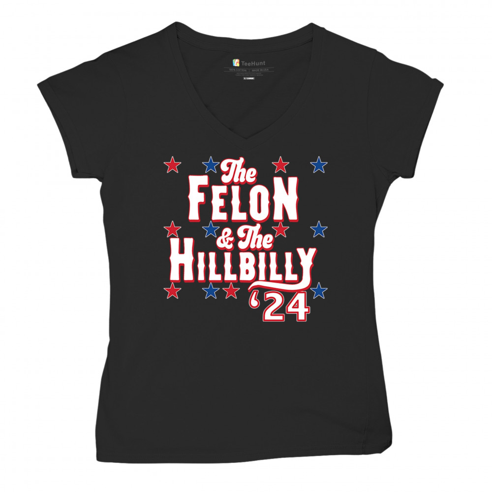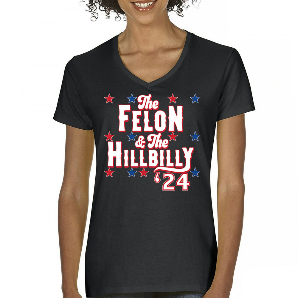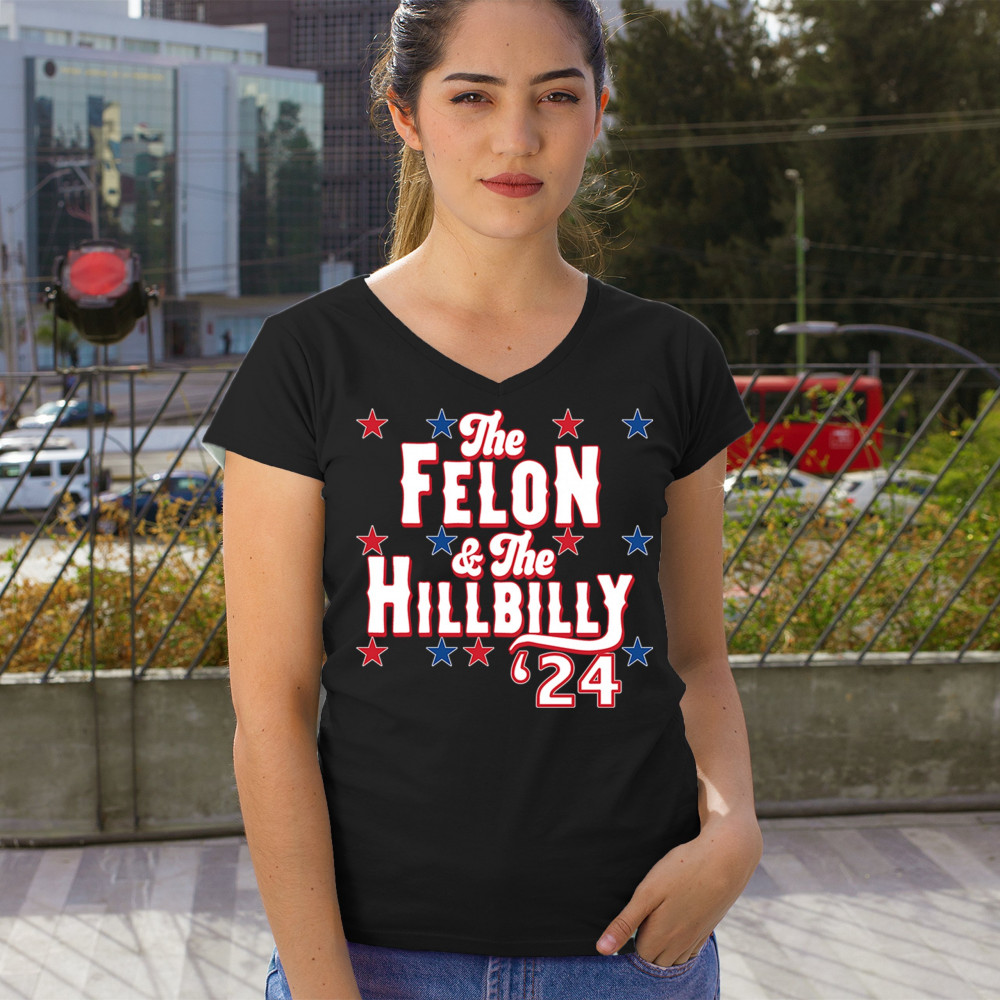 Humorous pro-Trump and Vance design for the 2024 election. "The Felon & The Hillbilly '24" captures conservative pride and humor in one bold statement.
