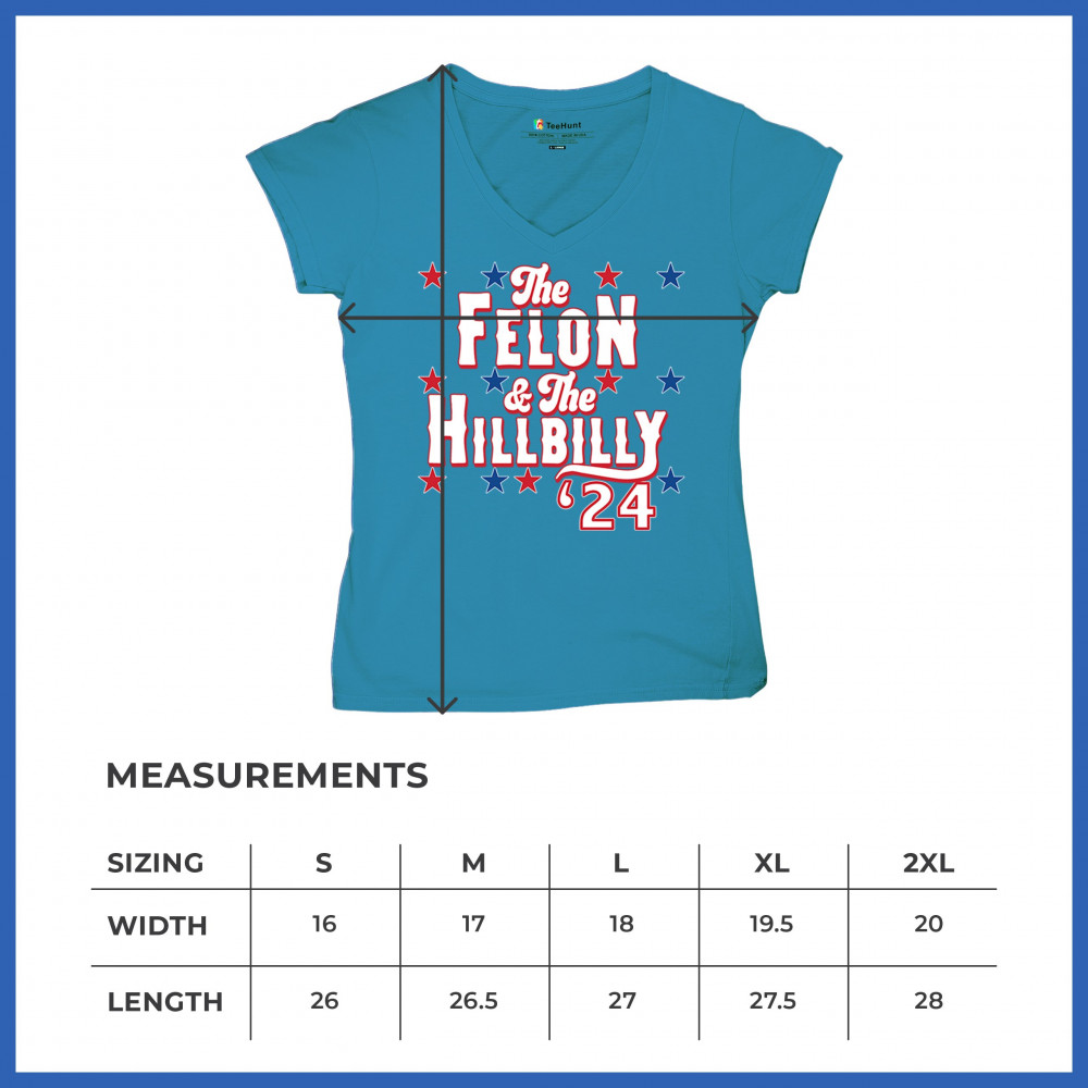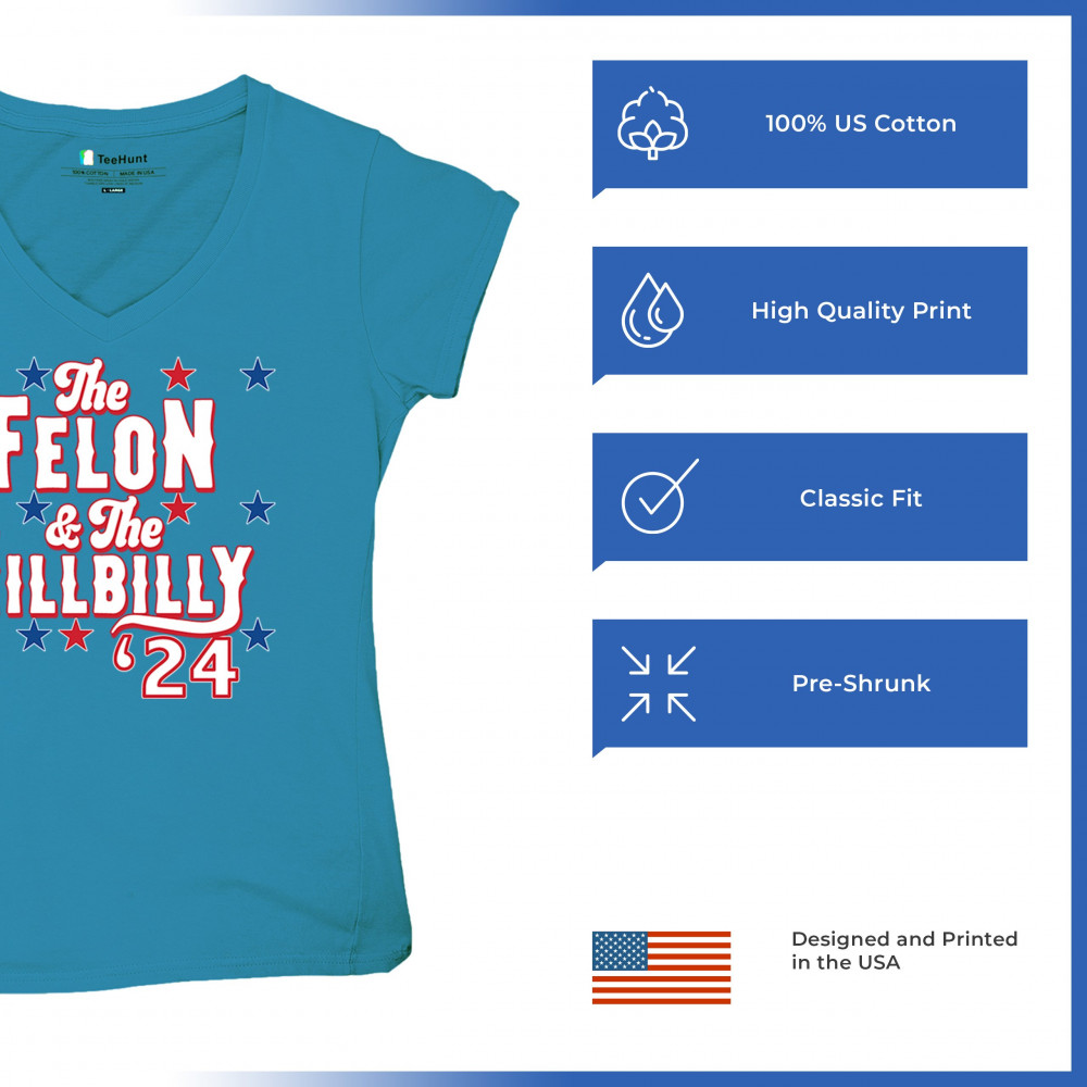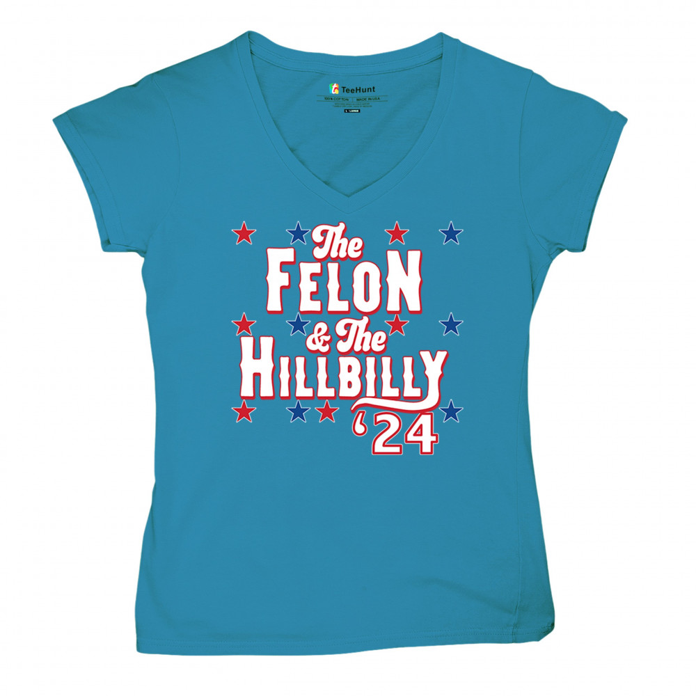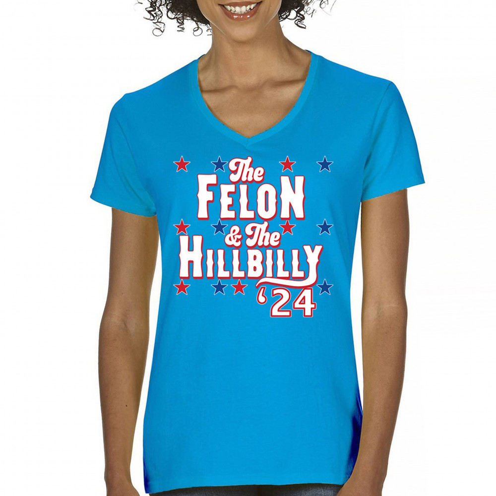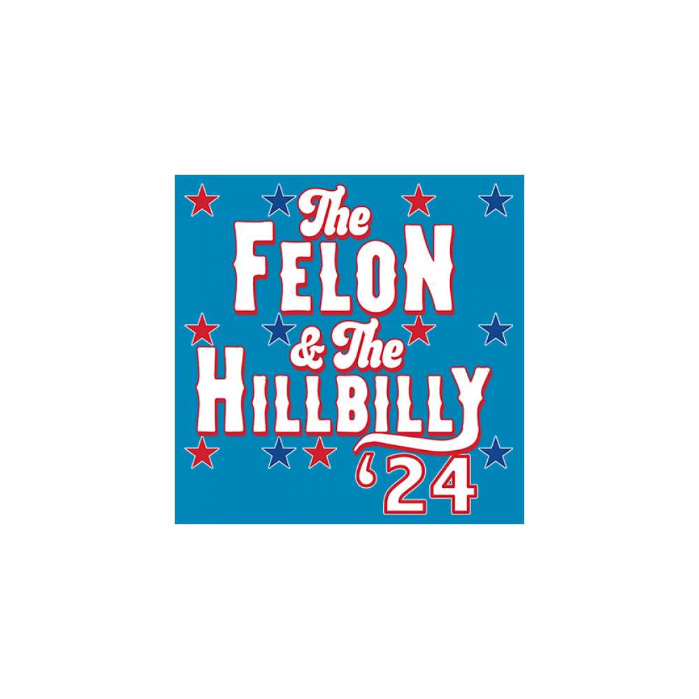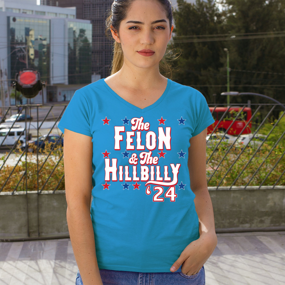Humorous pro-Trump and Vance design for the 2024 election. "The Felon & The Hillbilly '24" captures conservative pride and humor in one bold statement.