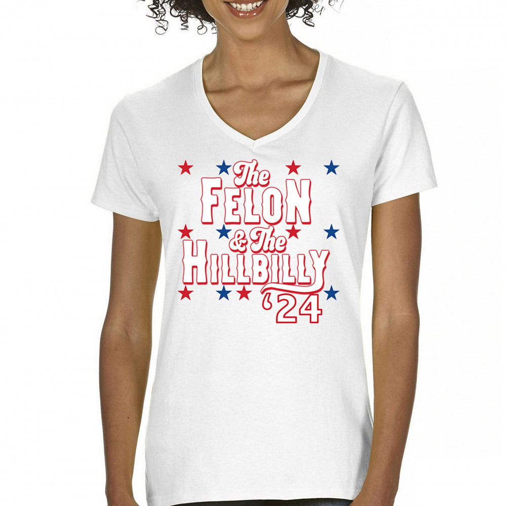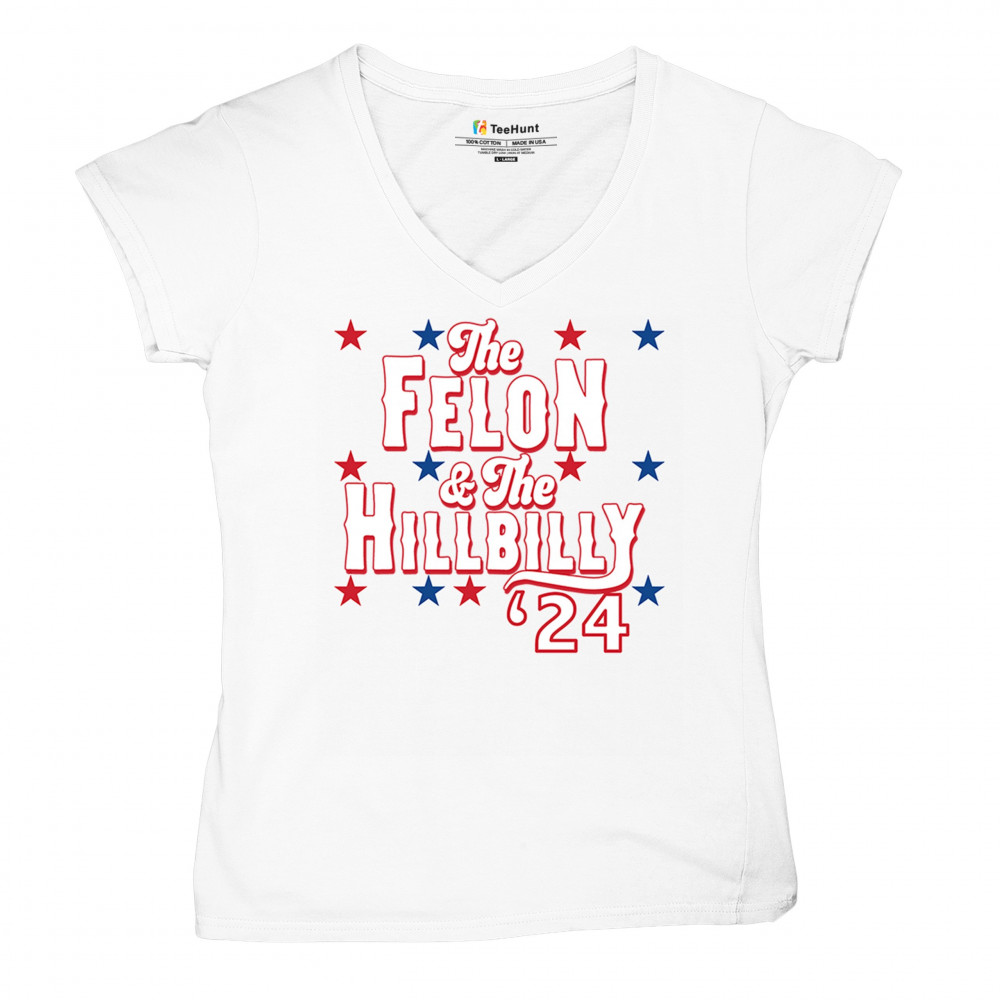 Humorous pro-Trump and Vance design for the 2024 election. "The Felon & The Hillbilly '24" captures conservative pride and humor in one bold statement.
