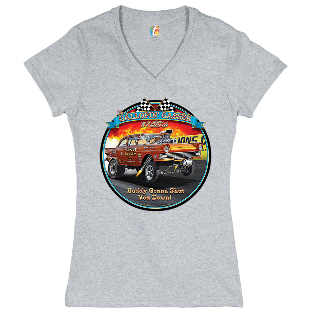 A print featuring a supercharged Ford Gasser sprinting on it's rear wheels in a drag race leaving burning tracks behind it. The print also features a pair of racing flags and says: "The Gallopin' Gasser '57 Ford" and "Buddy Gonna Shut You Down!". A great