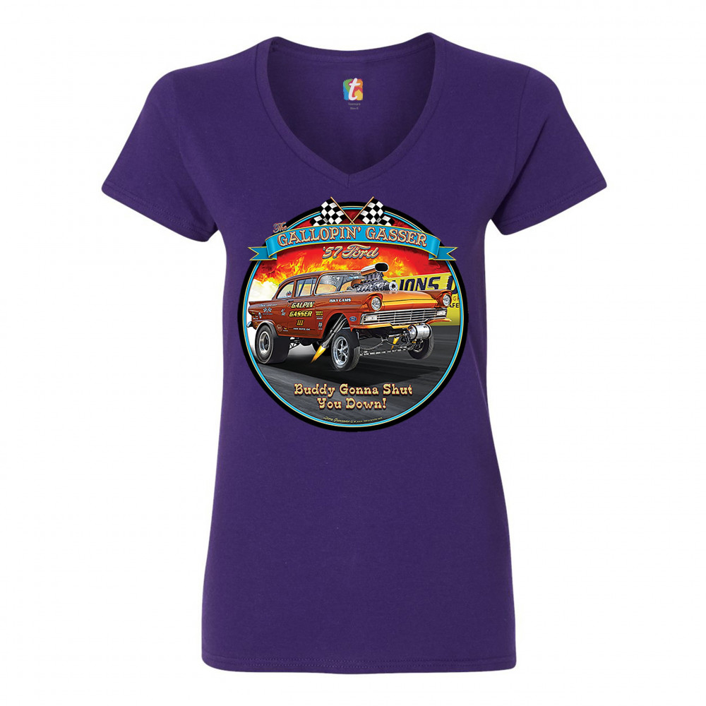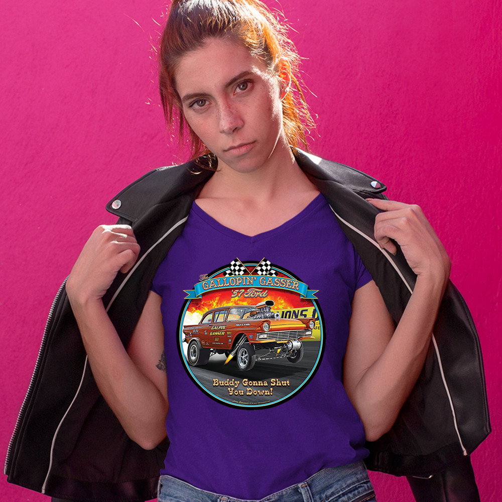 A print featuring a supercharged Ford Gasser sprinting on it's rear wheels in a drag race leaving burning tracks behind it. The print also features a pair of racing flags and says: "The Gallopin' Gasser '57 Ford" and "Buddy Gonna Shut You Down!". A great