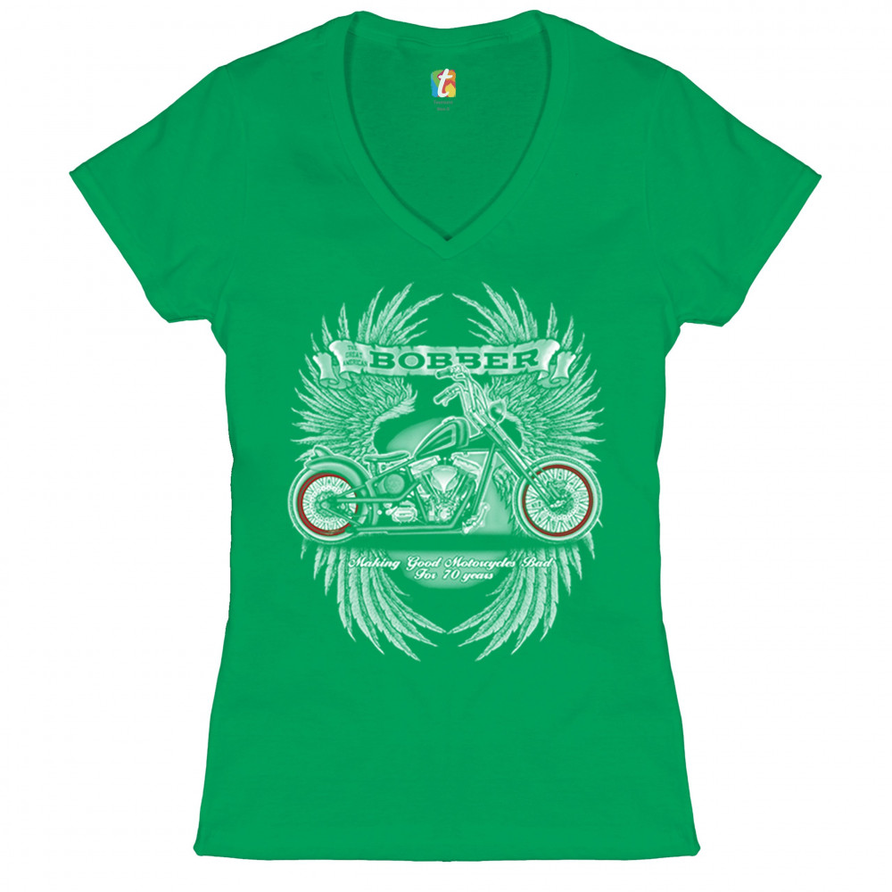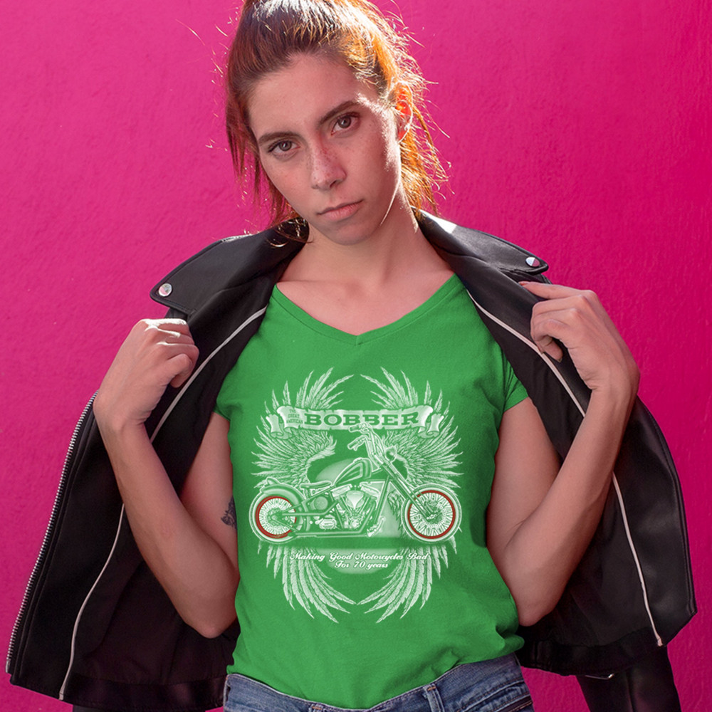 A print featuring a bobber motorcycle and a pair of wings in the background. At the top there is a stripe with "The great American bobber" written on it. At the bottom the print says: "making good motorcycles bad for 70 years". A great choice for a motorc