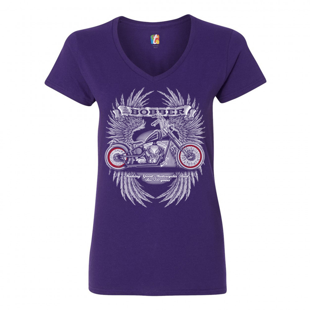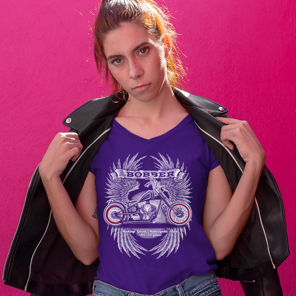 A print featuring a bobber motorcycle and a pair of wings in the background. At the top there is a stripe with "The great American bobber" written on it. At the bottom the print says: "making good motorcycles bad for 70 years". A great choice for a motorc