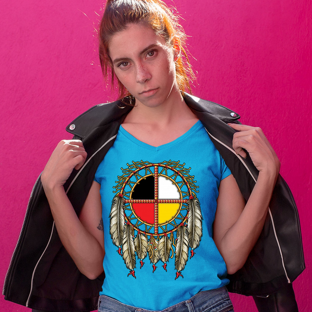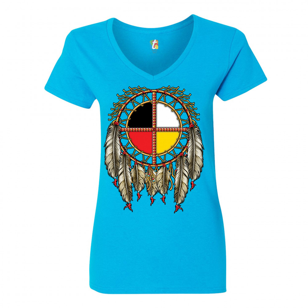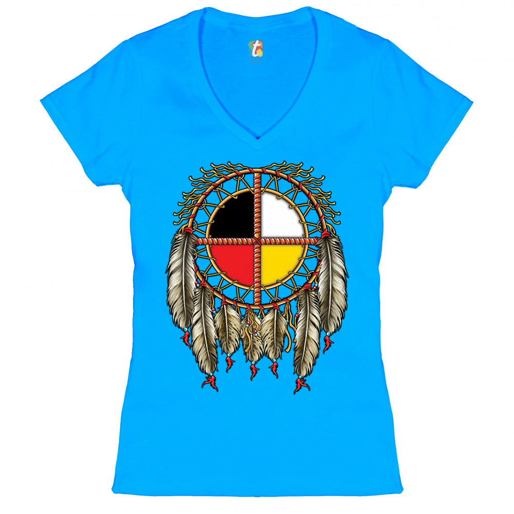 THE MEDICINE WHEEL DREAMCATCHER women's v-neck t-shirt native american tee turquoise
