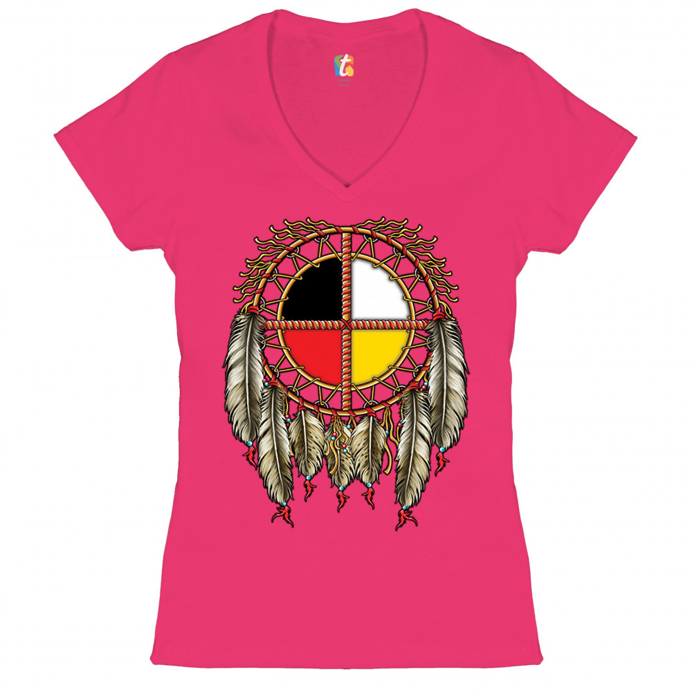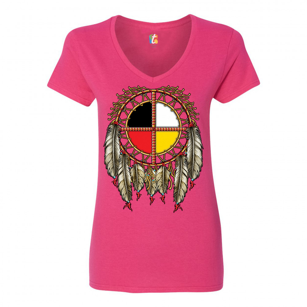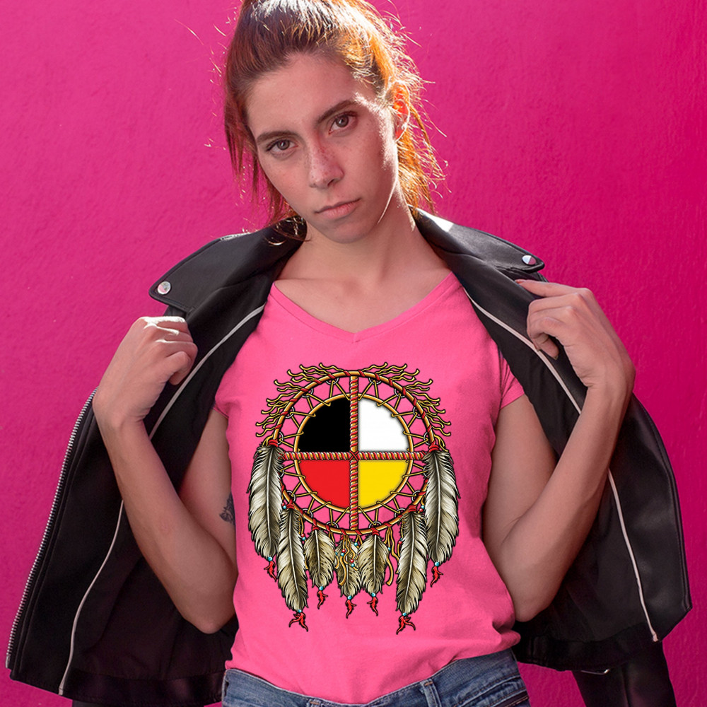 THE MEDICINE WHEEL DREAMCATCHER women's v-neck t-shirt native american tee pink