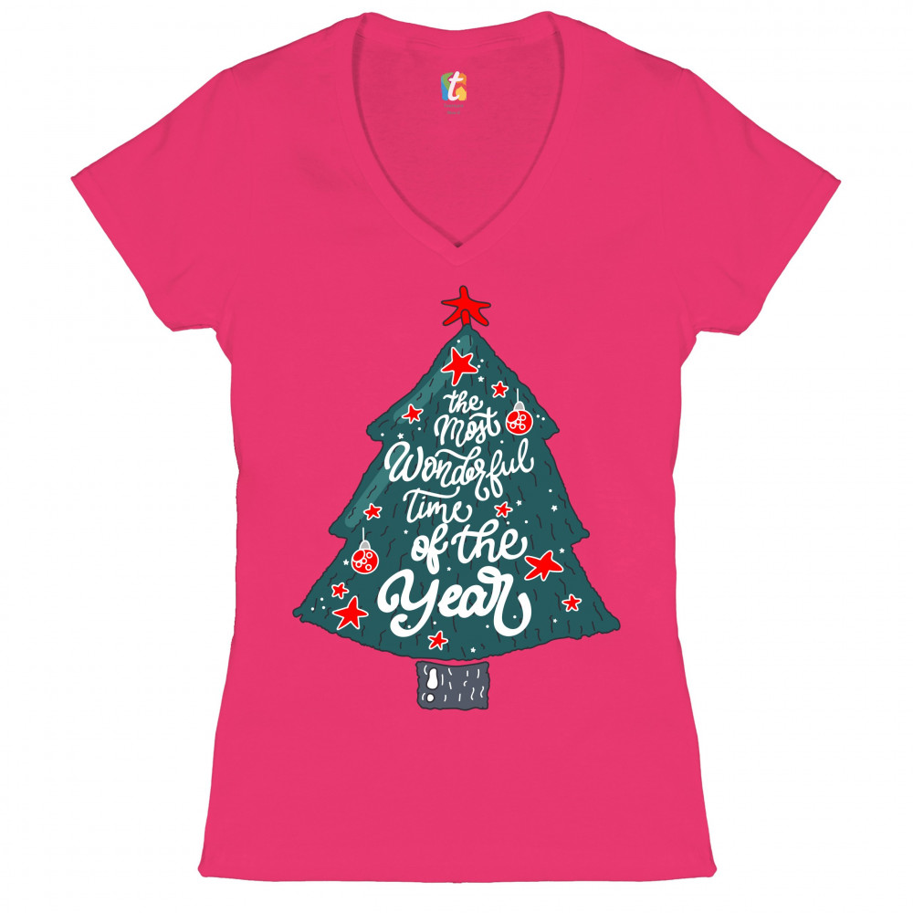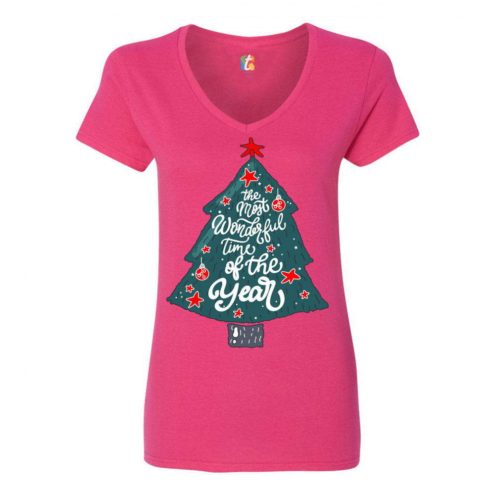 THE MOST WONDERFUL TIME OF THE YEAR women's v-neck t-shirt christmas tree tee pink
