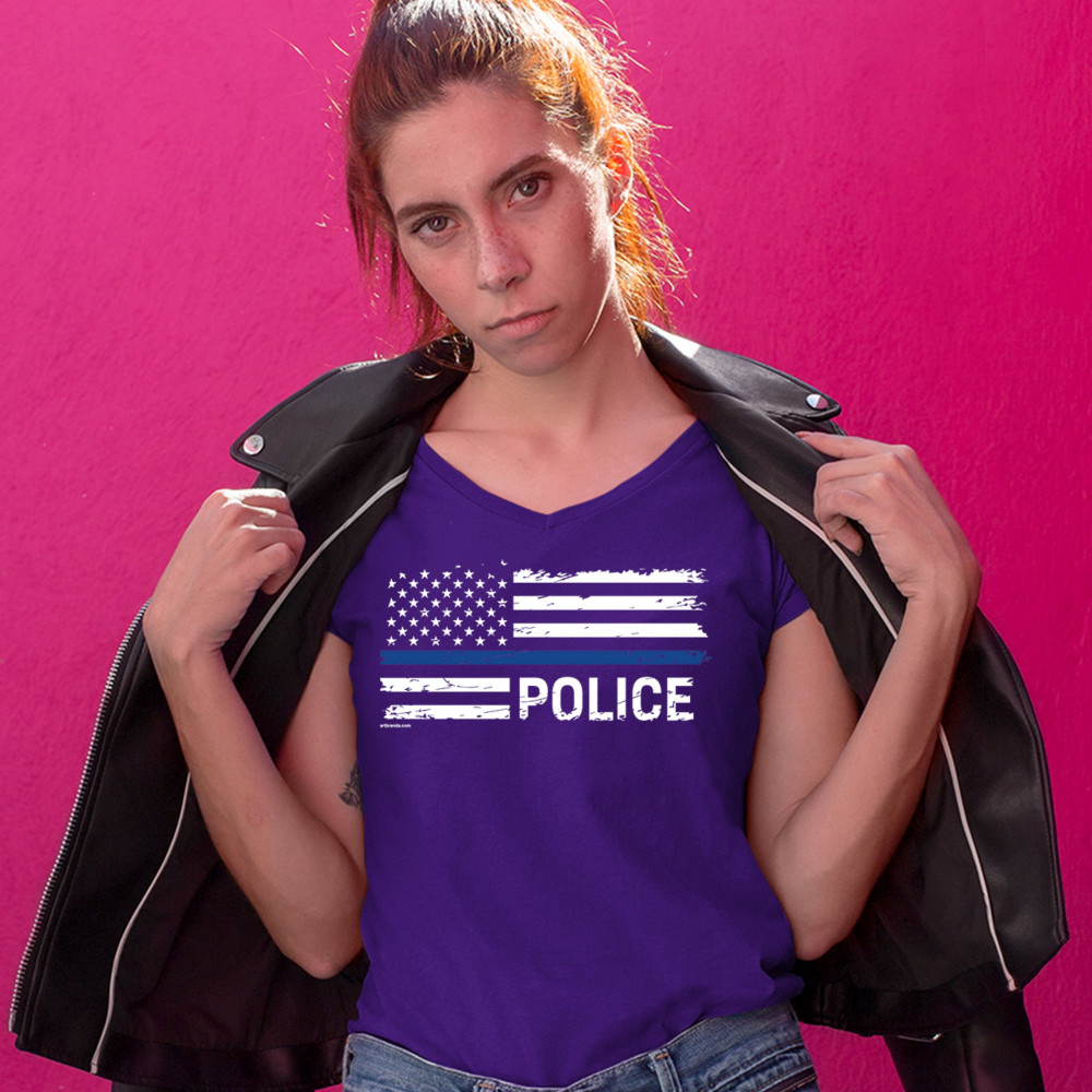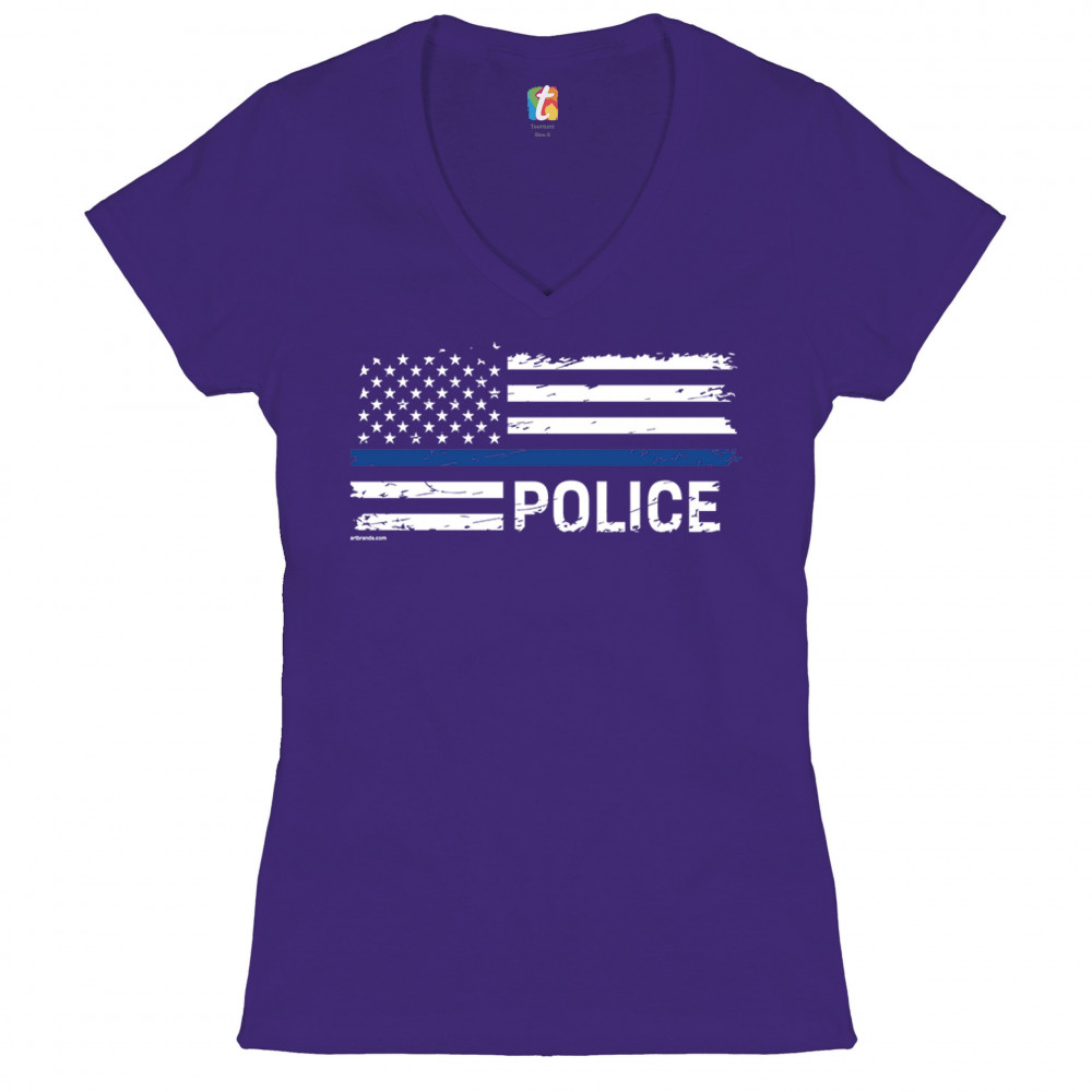THIN BLUE LINE AMERICAN FLAG women's v-neck t-shirt police law enforcement tee purple