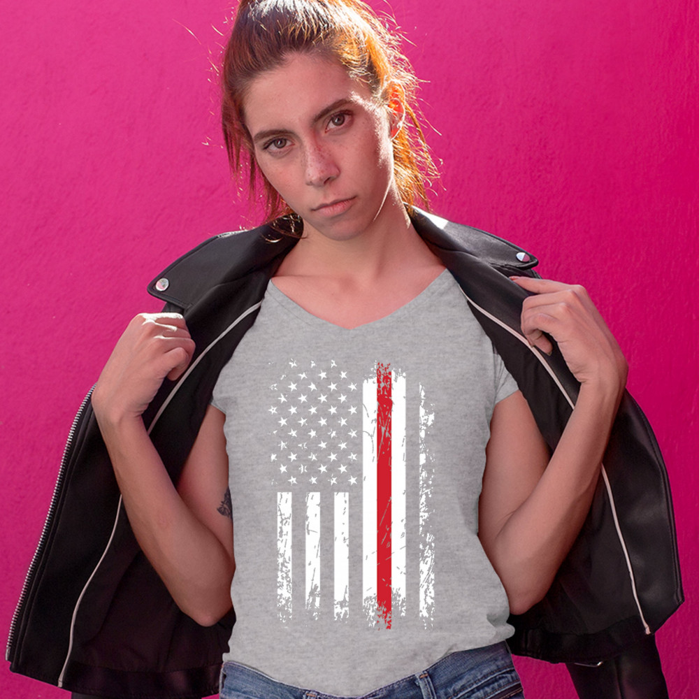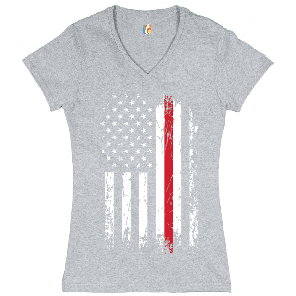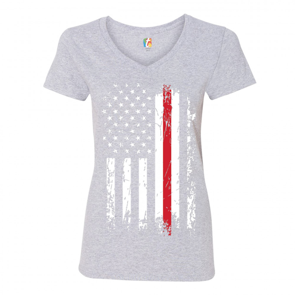 THIN RED LINE women's v-neck t-shirt american flag firefighter patriotic tee gray