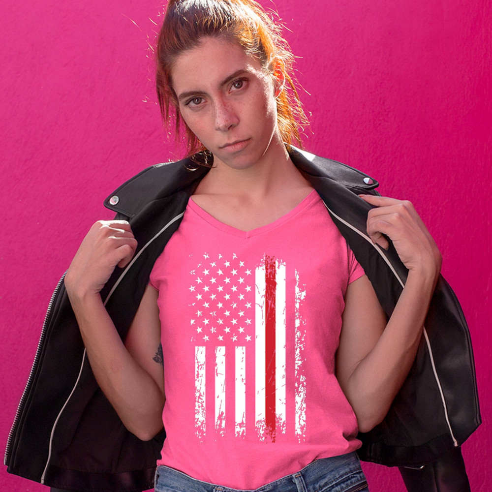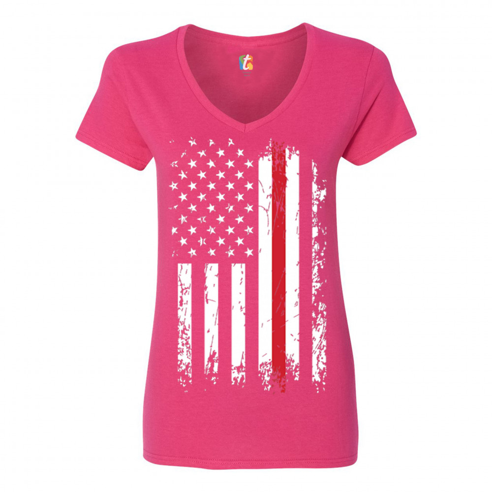 THIN RED LINE women's v-neck t-shirt american flag firefighter patriotic tee pink