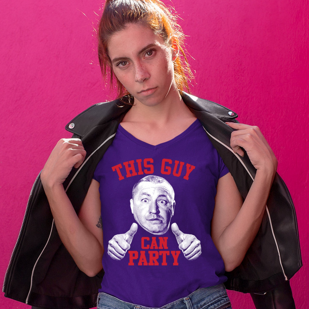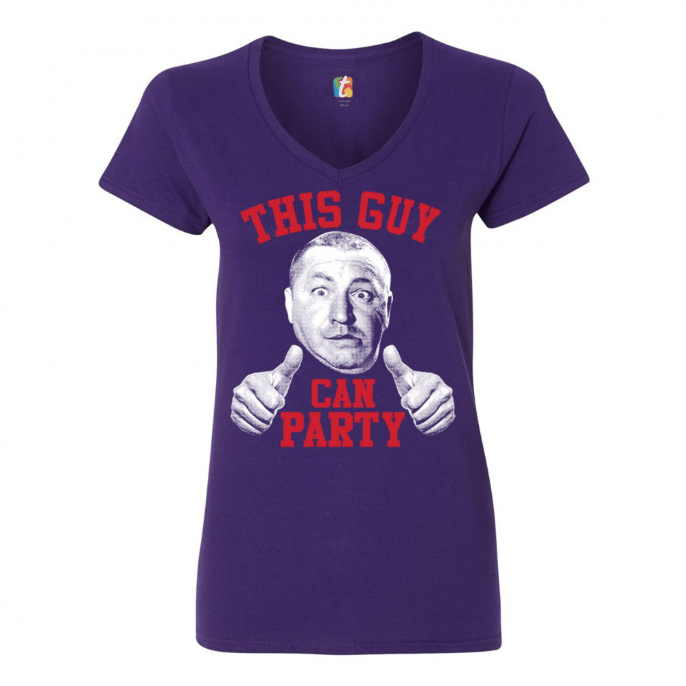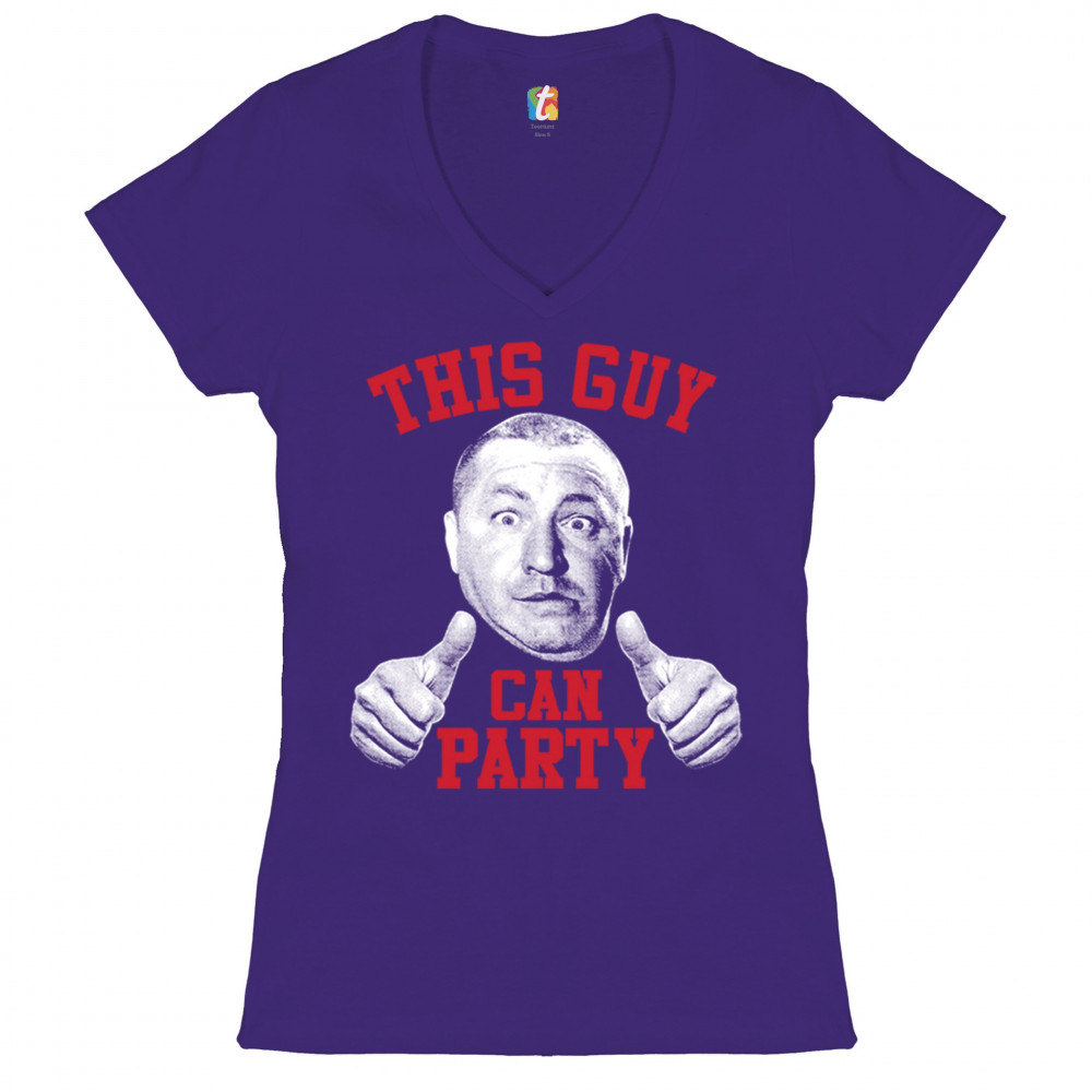 THIS GUY CAN PARTY women's v-neck t-shirt curly howard the three stooges tee purple