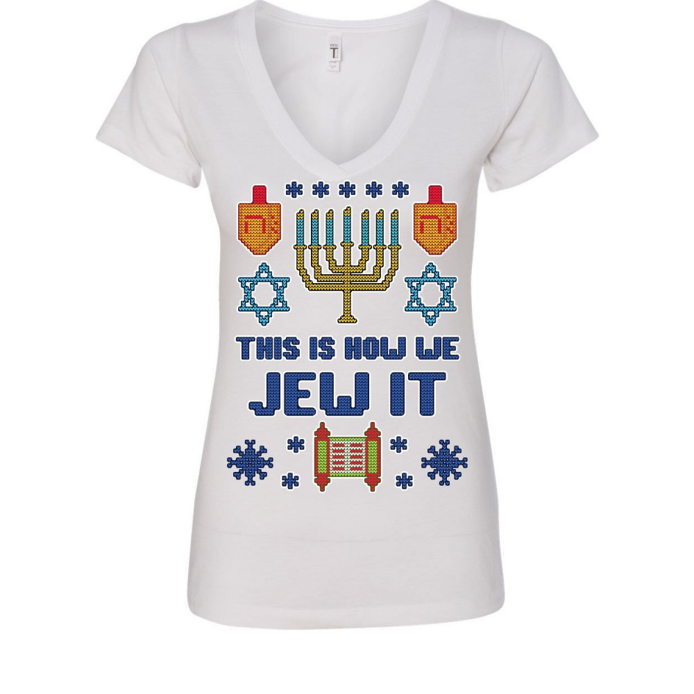THIS IS HOW WE JEW IT UGLY SWEATER this is how we jew it ugly women's v-neck t-shirt hannukah torah menorah funny white