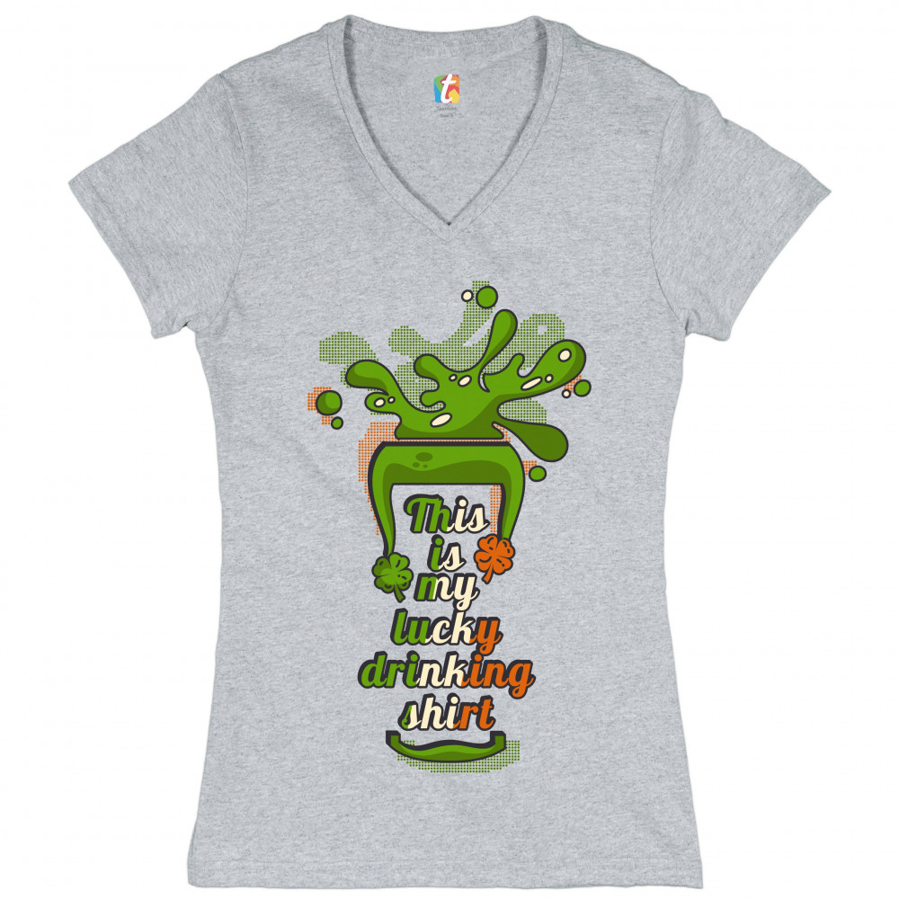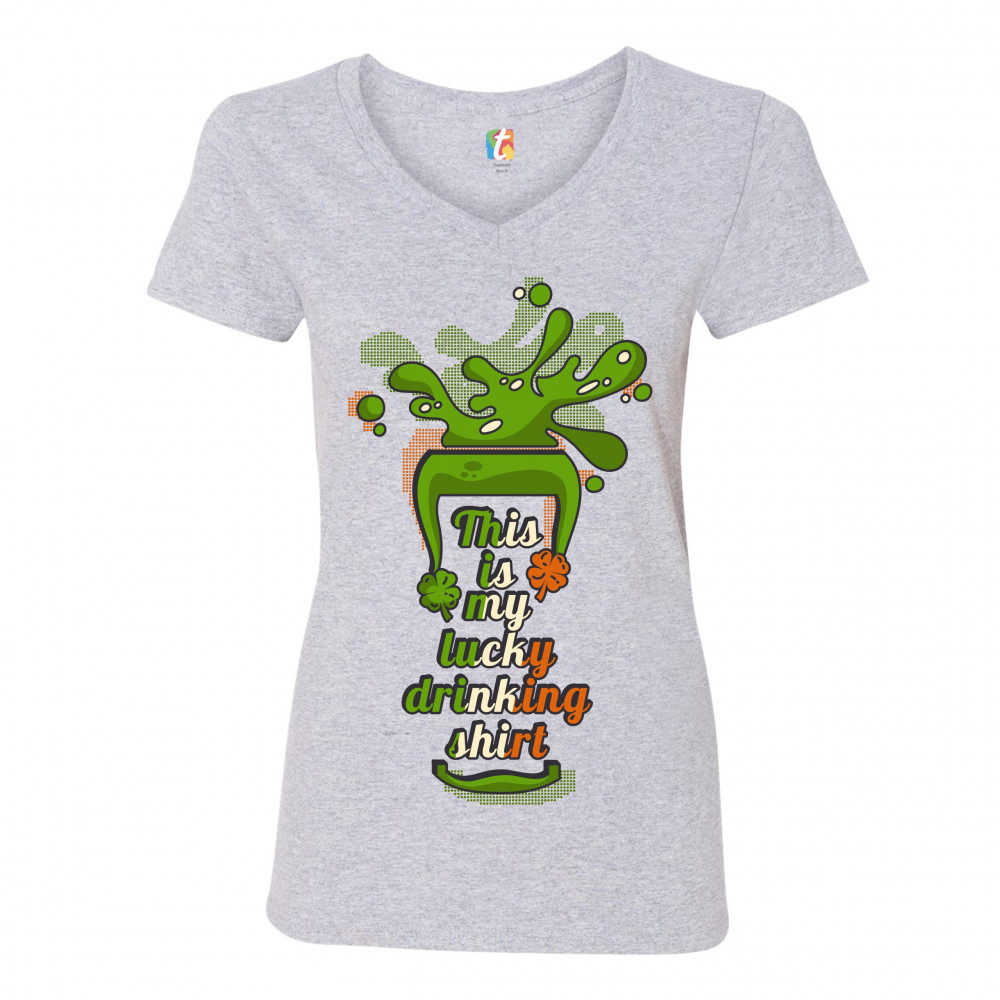 A print featuring a silhouette of a glass with beer spilling out of it. Inside the glass there is a text: "This is my lucky drinking shirt" in the colors of the flag of Ireland. A great choice to wear on March 17 to celebrate the St. Patrick's Day and sho