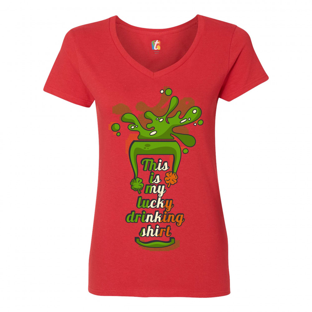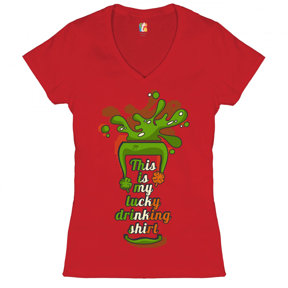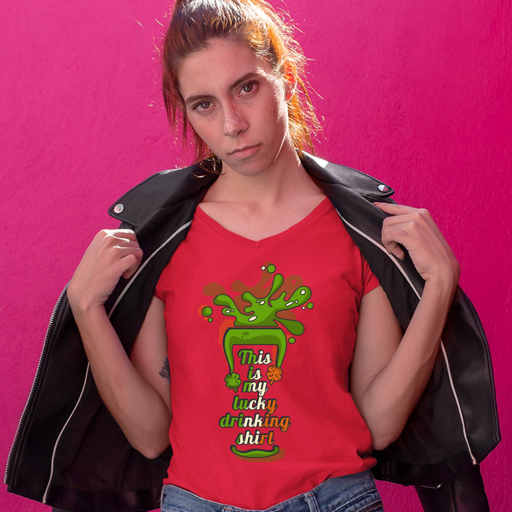 A print featuring a silhouette of a glass with beer spilling out of it. Inside the glass there is a text: "This is my lucky drinking shirt" in the colors of the flag of Ireland. A great choice to wear on March 17 to celebrate the St. Patrick's Day and sho