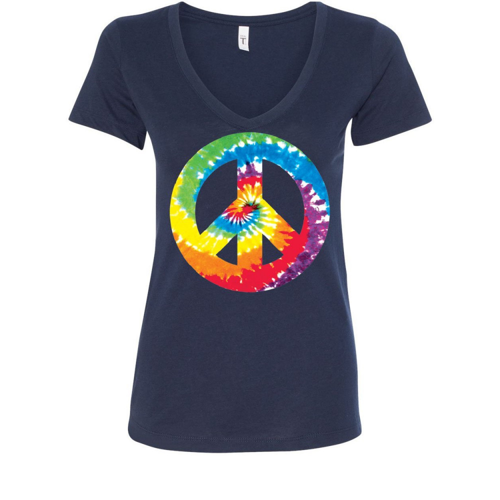 TIE DYE PEACE SYMBOL 80'S women's v-neck t-shirt hippie happiness love not war navy blue