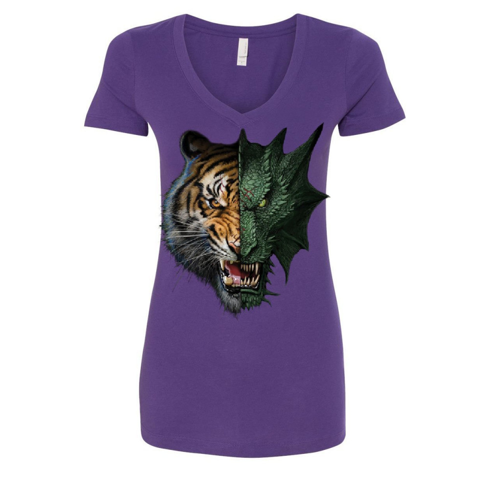 TIGER DRAGON FACE tiger and dragon face women's v-neck t-shirt animal beast fantasy monster fang purple