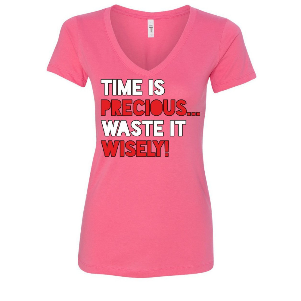 TIME IS PRECIOUS WASTE IT WISELY! time is precious waste it wisely women's v-neck t-shirt college humor lazy fun pink