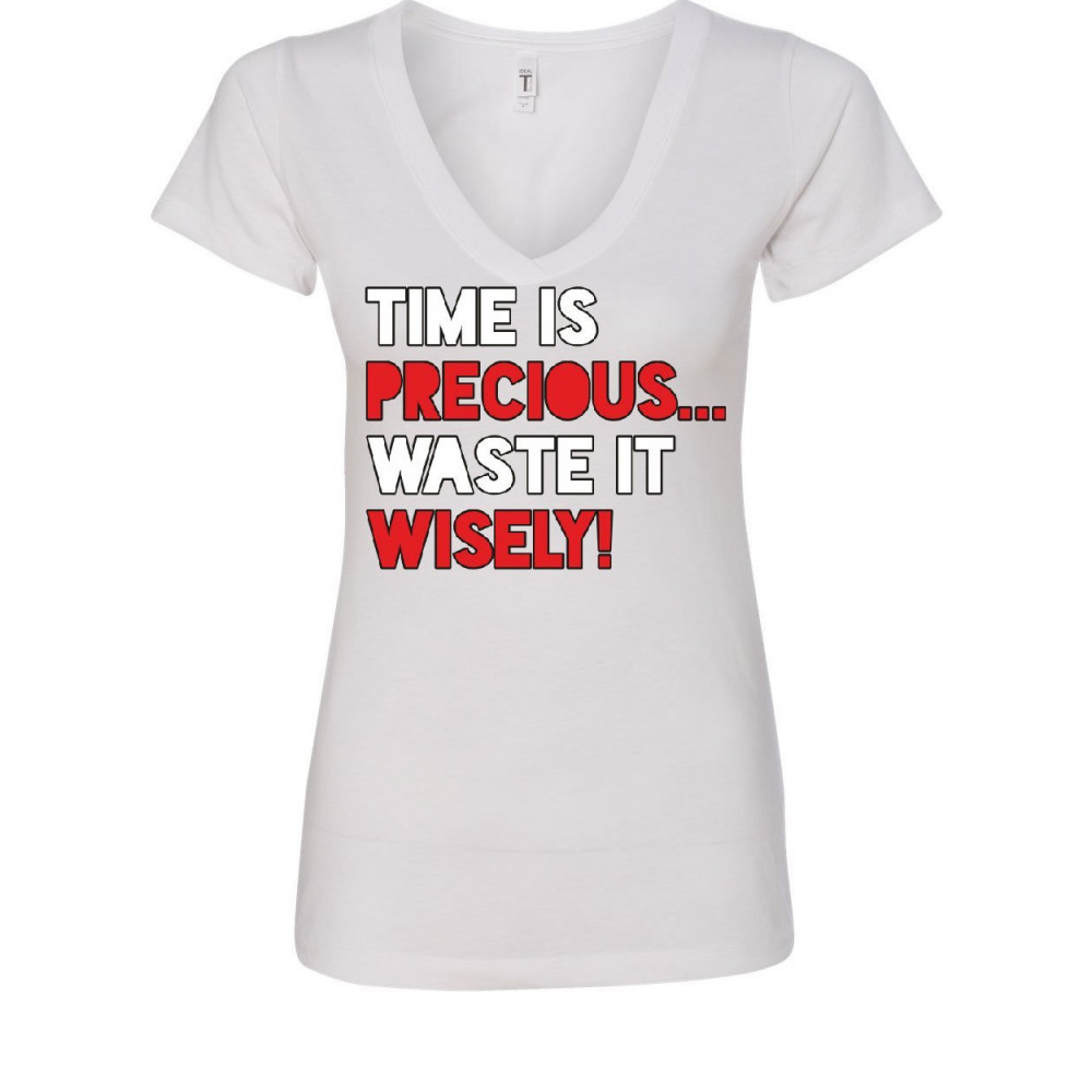 TIME IS PRECIOUS WASTE IT WISELY! time is precious waste it wisely women's v-neck t-shirt college humor lazy fun white