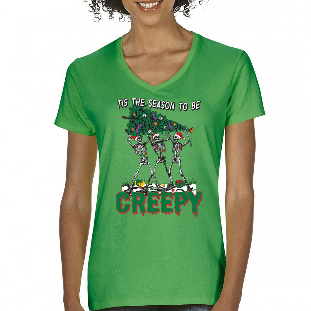 "Tis the Season to Be Creepy" combines holiday cheer with a hauntingly fun twist. This creative design features skeletons donning Santa hats as they carry a spooky Christmas tree decorated with eerie ornaments. Perfect for holiday gatherings, Secret Santa gifts, or themed parties, this design celebrates the festive and the macabre. Embrace the jolliest and creepiest bunch this season with this standout apparel.